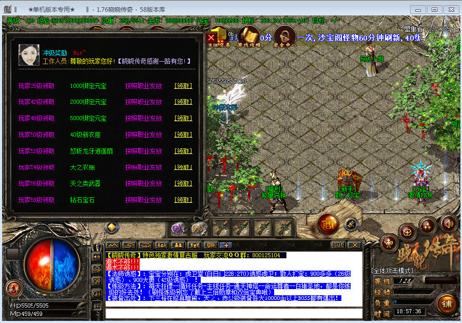 1.76晓晓传奇·斩妖滴血复古传奇版本-镇妖塔-毒蛇山谷-祖玛阁-布料铺 健康游戏忠告 抵制不良游戏 拒绝盗版游戏 注意自身保护 谨防受骗上当 适度游戏益脑 沉迷游戏伤身 合理安排时间 享受健康生活 晓晓传奇 独家制作 玩家QQ交流群:【关于封挂】:发现开挂者立即关监狱,登陆本服务器需要专用登陆器,否则不能登陆,是为了禁止外挂的出现,登陆器按F12呼出自带内挂,封穿人穿怪。本服务器禁止任何外挂,取空白游戏名字,发现空白名字或外挂者,不管是否花钱,立即永久封号,美国的IP也给你封掉!【关于爆率】:10000血以上的BOSS都有几率爆出天之装备,通天神塔为120分钟刷新一次,沙宝阁怪物60分钟刷新,40级新衣服爆率为1/30,天之赤月首饰爆率1/100、暗之赤月恶魔:爆(屠龙)爆率1/100、圣龙:爆(天之屠龙)爆率1/100【举报方式】:若发现外挂或任何关于游戏BUG问题,以及好的建议,请及时与我们的服务器故障员联系:QQ:,若信息对服务器有帮助,我们将给与一定的奖励,我们始终坚持以你提我改的信念来运行,相信有您的参与战火公益传奇才会更精彩!【攻沙奖励】:攻城期间为防止外援,禁止45级以下小号进入皇宫,号角爆率1/1,开区第3天统一设置攻城(不需要祖玛头像),首届城主奖励20000元宝,守沙奖励10000元宝,赶快召集玩家争夺这笔意外的财富吧!【游戏特色】:[回收装备]:可以换取【幸运二记忆链】【幸运二灯笼链】【幸运二虎齿链】【天之屠龙】【天之噬魂法杖】【天之逍遥扇】【融金石】【游戏命令】:[夫妻传送命令]:@查询夫妻 @允许夫妻传送 @夫妻传送 [师徒传送命令]:@查询师徒 @允许师徒传送 @师徒传送 [联盟命令]:@允许联盟 @取消联盟 @联盟 [行会命令]:@加入门派 @退出门派【元宝充值】:我们力争保证;公平、公证、公开、认真对待每一个玩家。本游戏不设管理员,不卖装备,不调级,只出售元宝,购买元宝请自行网上充值。元宝1:50 网银赠送100%【担保服务】:需要担保服务请与担保客服:800125104联系,我们会及时回复您的需求!担保服务收取25%服务费,本传奇属于长期散人服,好的装备绝对可以卖到米!记住我们的QQ群:800125104【合区公告】:如果新区与老区账号一样,只需要在账号后面加a、b、c、或重复几个依次排列下去即可!如果玩家账号是满的,后面不可以再加的时候,把最后一个数字或者字母去掉,再加a、b、或者c即可!【新手指南】:新来的朋友到土城右下角找[散人打宝],爆祖玛装备很轻松,回收海量元宝及经验等着你!【新手指南】:没有绑定的请到土城右下角找[冲级奖励]进行领取,保证您玩的就是不花钱的游戏!【新手指南】:登陆器如果显示游戏关闭需要重新打开登陆器,即可正常登陆!【法师诱惑】:宝宝分别在:虎卫堂(白日门228:270)诱惑虎卫;散人打宝:900多多(26级诱惑)、900大勇(42级诱惑) !【练级方法】:每天拉镖--循环任务-主线任务-通天神塔--命运尊者--白猪圣地,都是你练级的好去处!(刷怪练级别忘了戴上三倍勋章和双倍宝典哦)【装备出处】:下三格在修真暗殿,天之、赤炎级装备各大10000血以上BOSS都有爆出!【幸运项链】:土城右侧NPC[幸运]综合服务员可以把普通【赤炎级项链】增加上幸运值!