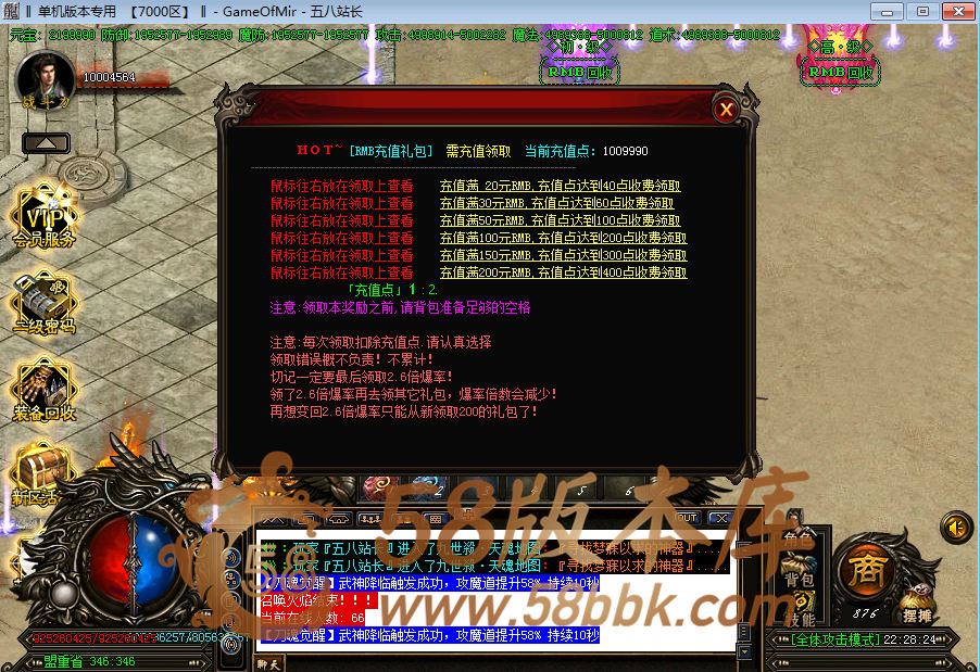 土豪玩法:充值满回馈 (转生.升级称号.升级宠物.升级右手盾牌) 直接PK打装备