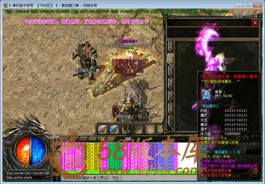 爆率介绍:BOSS是小怪的10倍爆率,白色-黄色-红色,boss别轻易挑战,可能你还没过去就死了!红色请血量20亿以上再去挑战,散人福利地图刷新超级BOSS年兽!超级宝藏进去就发财了!