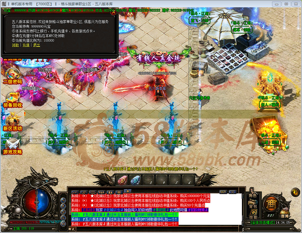 温馨提示:必做事项:新手上线先打元宝升级秒血服和等级,本游戏所有装备全出,脸黑的可以直接合成!