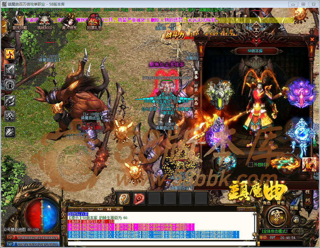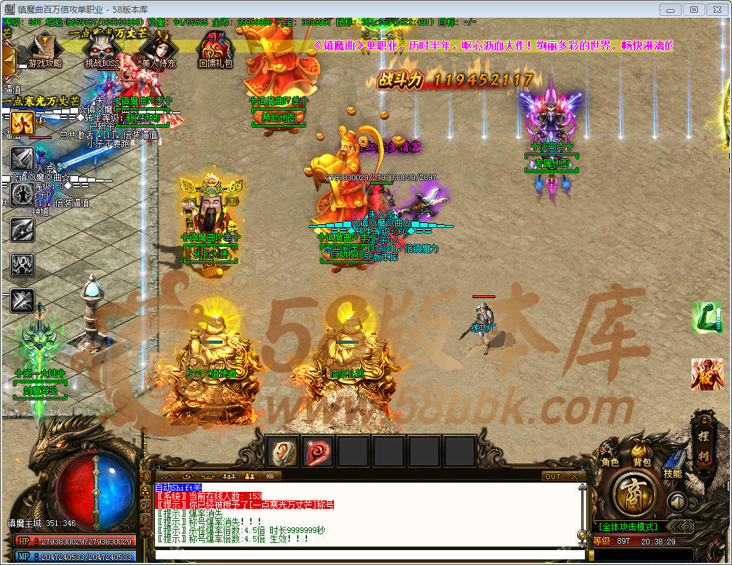 【攻城奖励】:当日新区第二天上午合区.晚上开启攻城.奖励丰厚元宝+镇魔币+688米奖励