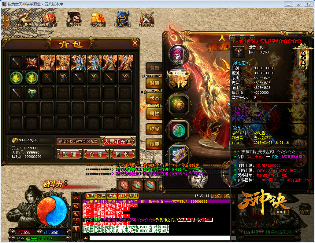 本服特点:元宝和天神币非常好打,独家爆率系统,所有装备靠打,爆率百分百全开!