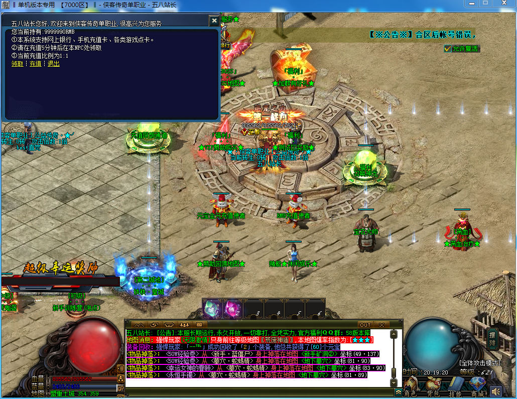 【※公告※】历时六月打造,2018年初最具特色单职业版本,全部装备靠打,所有装备0级佩戴,打到就是赚到,真正散人服。【※公告※】金米比例1:100,网银比例1:100。统一官网充值平台充值,无任何在线管理或元宝代理,请玩家谨防上当受骗。【※公告※】本服为单职业特色版本,PK技术全新玩法,不变态,无秒杀,PK畅爽刺激。【※公告※】本服加入大量最新玩法,小怪与BOSS均可爆出高级装备与材料,人人可拿终极,真正的散人服,只要花时间一切都有。【※公告※】本服强烈打击外挂脱机,发现一次封号处理,多次发现封机器码及降0级0转生,使用小号试挂,同IP大小号全部删除。空白名字,定期清理,请玩家勿建空白名。【※公告※】每天五区,新区准时准点开放,每日至少万米广告,人气区区饱满,,如果大家觉得本服不错,请介绍给你的朋友。【※公告※】年度最具特色单职业,活动超多,终极装备与直接在游戏活动BOSS中可以爆出,奖励人人可抢。【※公告※】合区后帐号错误,请在帐号后加a,如果仍然有误,则改为加b、c、d,若帐号长度已满10位,无法在后面加字母,则将最后一位改为a、b、c、d多试几次。
