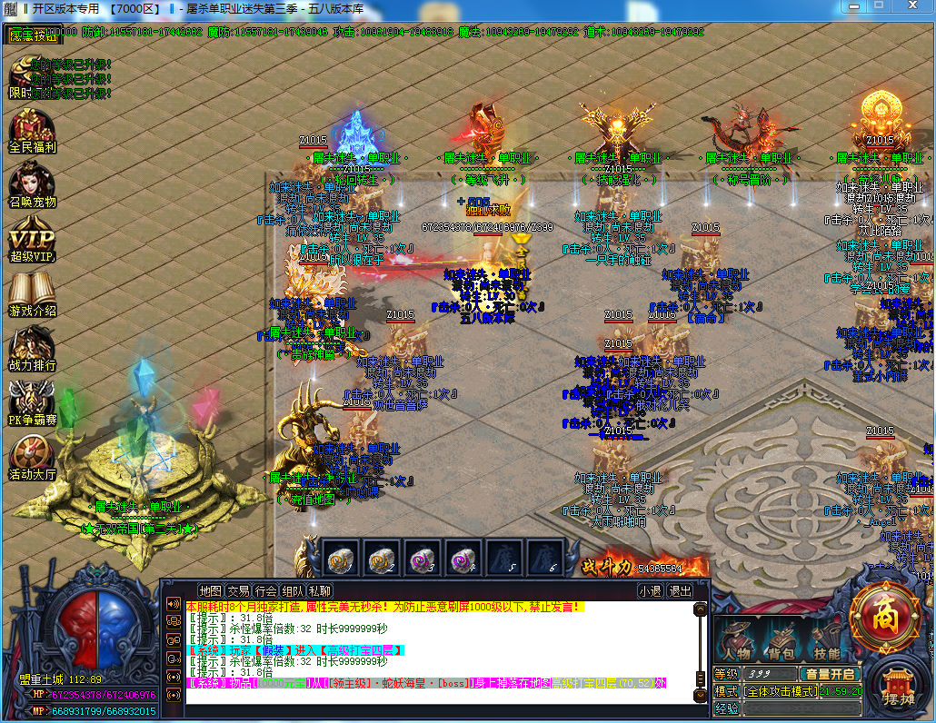 ·【元宝比例】·正常充值比例元宝1:200 积分1:1 恶魔币1:1 充值点1:1 点卡多送90% 网银100% 多充多送!·【攻城奖励】·新区第2天攻城奖励88米+『十步一杀技能』,老区奖励『恶魔币+锻造灵石』·【装备介绍】·杀神套-恶魔套-秒杀套-天下套-轩辕套-帝王套-恶魔→至尊套。。·【版本特色】·装备,积分,恶魔币,充值点,一切全部有爆,不花钱一样牛逼·【版本特色】·免费泡顶级,会员免费领,地图免费进,散人玩家的天堂·【爆率介绍】·每天开放5个区,各区暴率:1区 2.0倍 2区2.3倍 3区2.4倍 4区2.5倍 5区2.7倍·【封死外挂】·全新GK封挂,开挂必封,有漏网的后台抓到直接删号处理,没有警告!