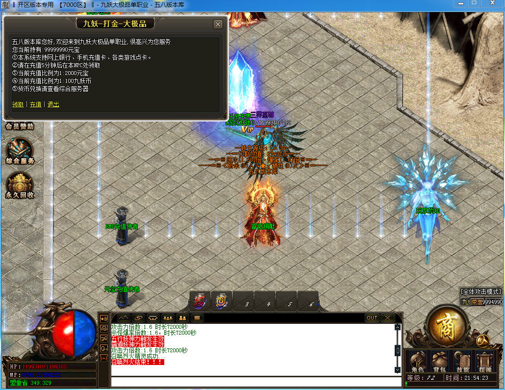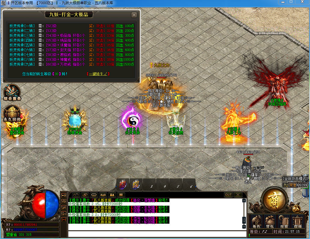 ★切记★ 散人有时间一样可以起飞,可能你打了一个不起眼的小怪就能爆出终极武器!骨灰玩家:1.开区两个号,一个土城泡点,另外一个去妖灵大陆打装备!2.慢慢升级九妖聖戒、称号(+切割+爆率+攻击) 60级进二大陆,小怪爆所有!会员玩家:1.领取充值,领取会员,[30米]顶级会员拥有10项超强特权!2.会员直接赠送【九妖聖戒[三级]】进魔天大陆打装备,转生!3.60级之后进二大陆,使用刀刀切割卷先打妖神三重天的BOSS (三层三个BOSS) 25-21处坐标进入4.地图没有严格限制进入条件,装备越好打的越快,二大陆小怪爆所有!土豪玩家:1.领取充值、领取会员、升满称号、渡劫成魔!2.升满九妖聖戒(共10级) 触发5倍全身刀刀切割+鞭尸功能!