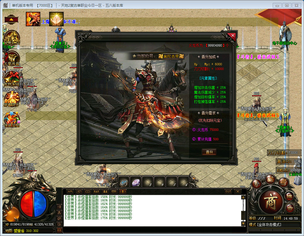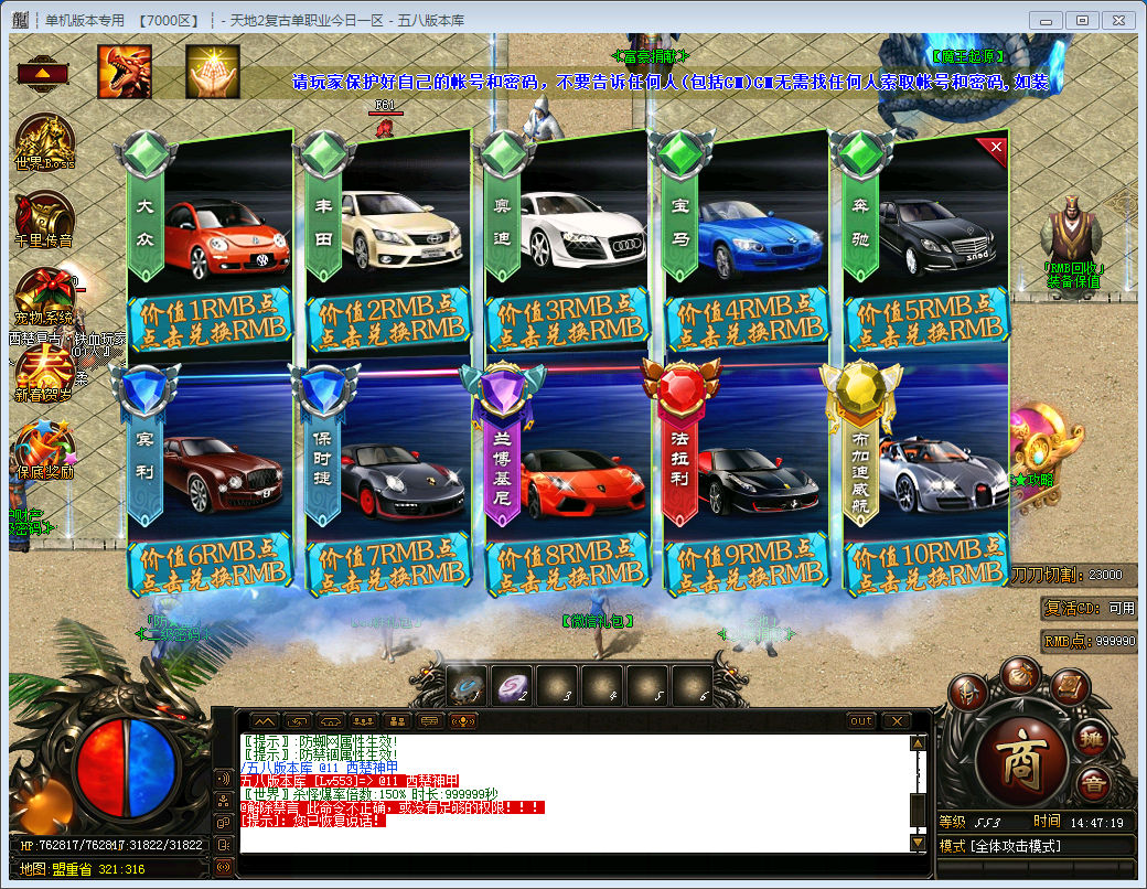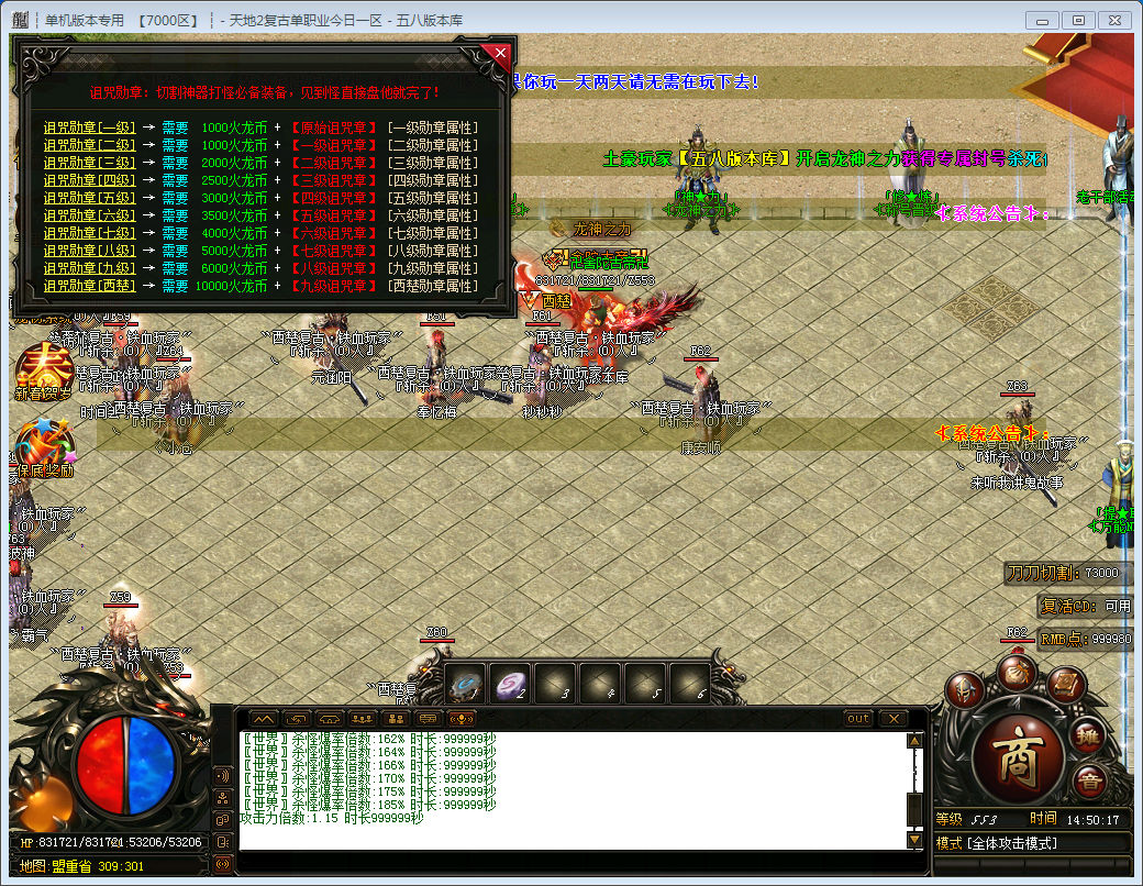 健康游戏忠告 抵制不良游戏,拒绝盗版游戏 注意自身保护,谨防受骗上当 适度游戏益脑,沉迷游戏伤身 注意自身保护,谨防受骗上当 为了您的游戏体验,请勿使用 非官方的第三方辅助工具插件 游戏中有改动请查看官方群号 祝您在游戏中多多赚钱发发发 西楚单职业·75662793 声明:游戏最终解释权归西楚官方所有打宝攻略-手把手教你赚钱,激情两不误!新手可在土城永恒幻界发育,首杀第一页BOSS在本地图随机查找,捐献称号有额外双倍地图!②条件允许充值50米满赞助,开启30米沙巴克捐献,10米点狂暴,3个小时即可回本!③购买西楚赞助的玩家,可直接去火龙大陆下五转地图打,火龙币,元宝装备材料全可卖钱④诅咒勋章27000火龙币合成,可叠加切割值倍数,最高5倍,配合称号可以叠加最大切割!⑤注意:皇帝时装-新区41776火龙币合成,12小时后价格自动翻倍,2次合区后关闭时装合成!⑥满称号159850火龙币,等价为1000充值。散人也可以自己打火龙币和装备晋升满称号!⑦76级后无泡点经验,请在土左下经验箱子与装备分解NPC处了解下升级方式,幽煌等物品保值!⑧灵魂模式只有本服守护神怪物爆出,其他全部靠开灵魂盒子获得,天启装备往上可以分解精粹!⑨虎符洗炼可获得20种BUF,玩家多变!虎符神殿分为4层,每层爆率叠加,很容易出终极装备!⑩注意:本服等级为130,升级需要天启以上装备,每次渡劫保底需要5个九玄金丹可通过!注:以上攻略本人精心缩写,只要认真打包赚钱,希望对您有所帮助,详情可咨询客服
