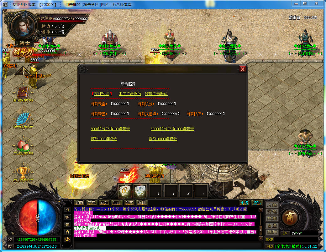 游戏介绍 元宝1:10万 充值点1:1 荣誉点1:1 测试充值多送30%!