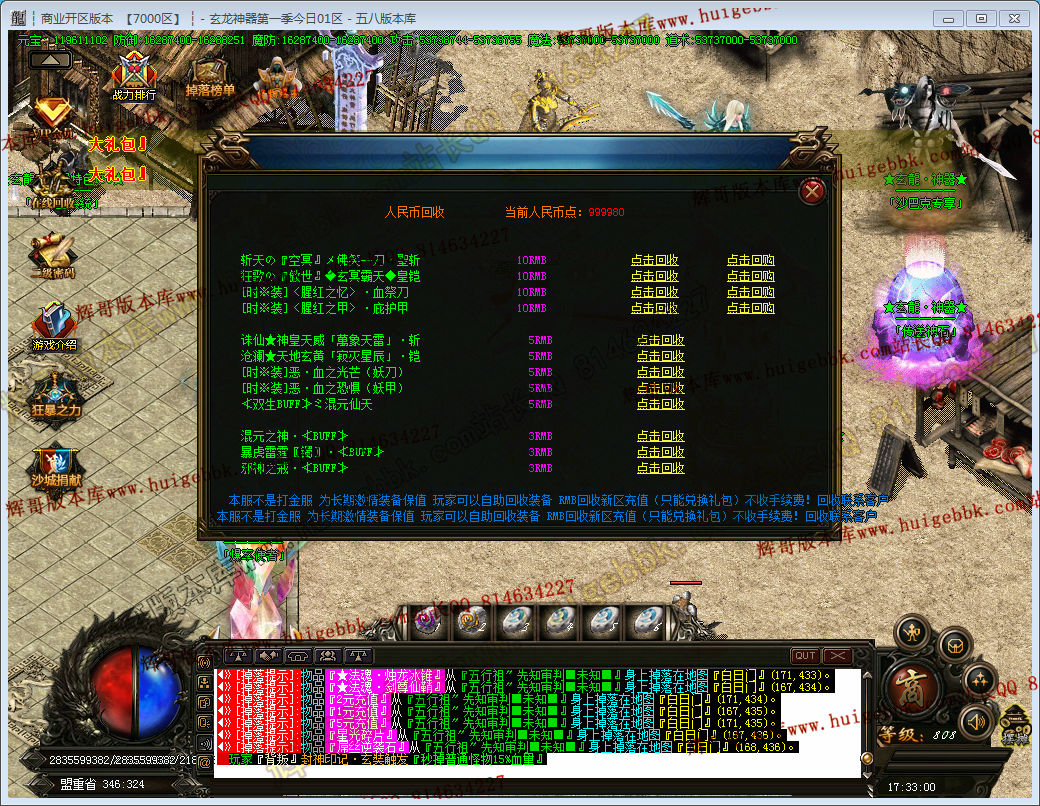进游戏先加群 领取QQ群礼包(里面有1小时3倍爆率+刀刀冰冻和秒血符).然后去新手地图打充值点.打到1600充值点去土城右下角领取3倍爆率,这个时候应该有不少元宝了,去土城左边把宠物升满.