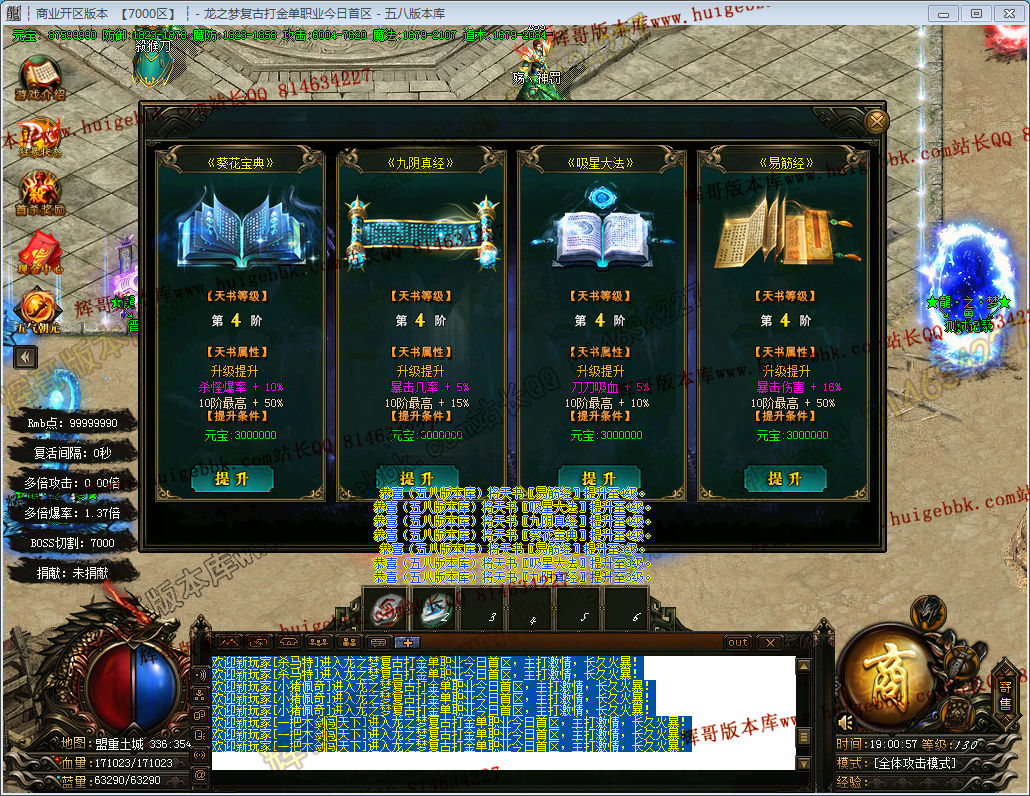 1:不管是玩家还是老板土豪 建议有多余元宝一定要先升级天书的爆率加成(哪怕只提升几次.爆率加成的感觉明显不一样(升满更爽).)