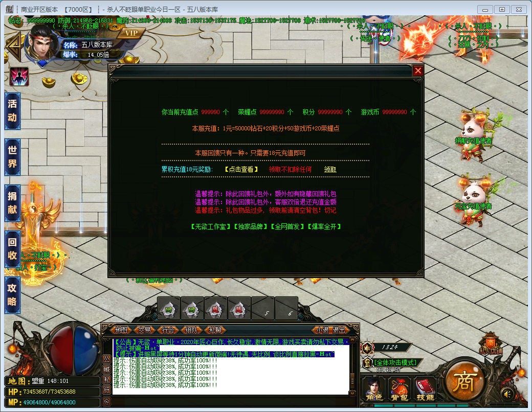 【杀人不眨眼】:|充值比例 1:50万钻石 1:50游戏币 1:10荣誉(暴爽、秒到)