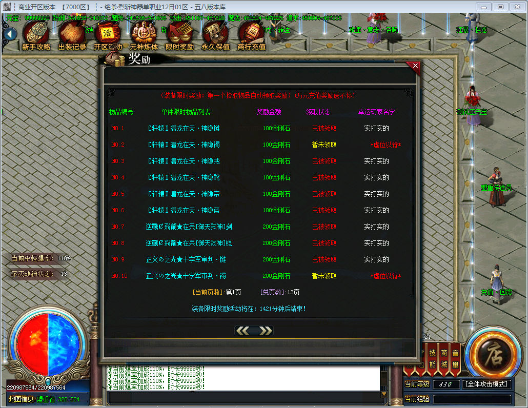 4.转生,等级,爵位都拥有终极大陆,本服活动奖励非常丰厚,记得定时参加,可爆出终极装备