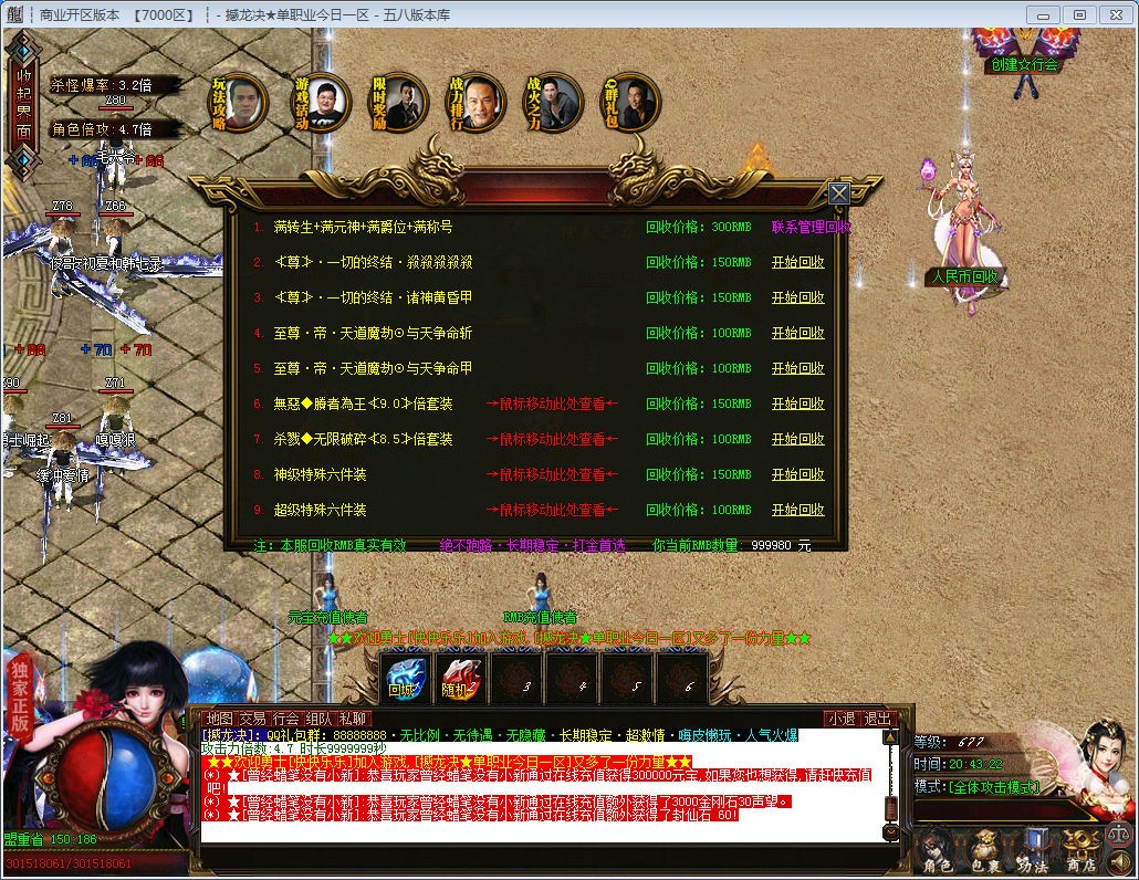 【回收系统】:次终极,终极,特殊装备,等级全部回收大米,物价保值,长久稳定.