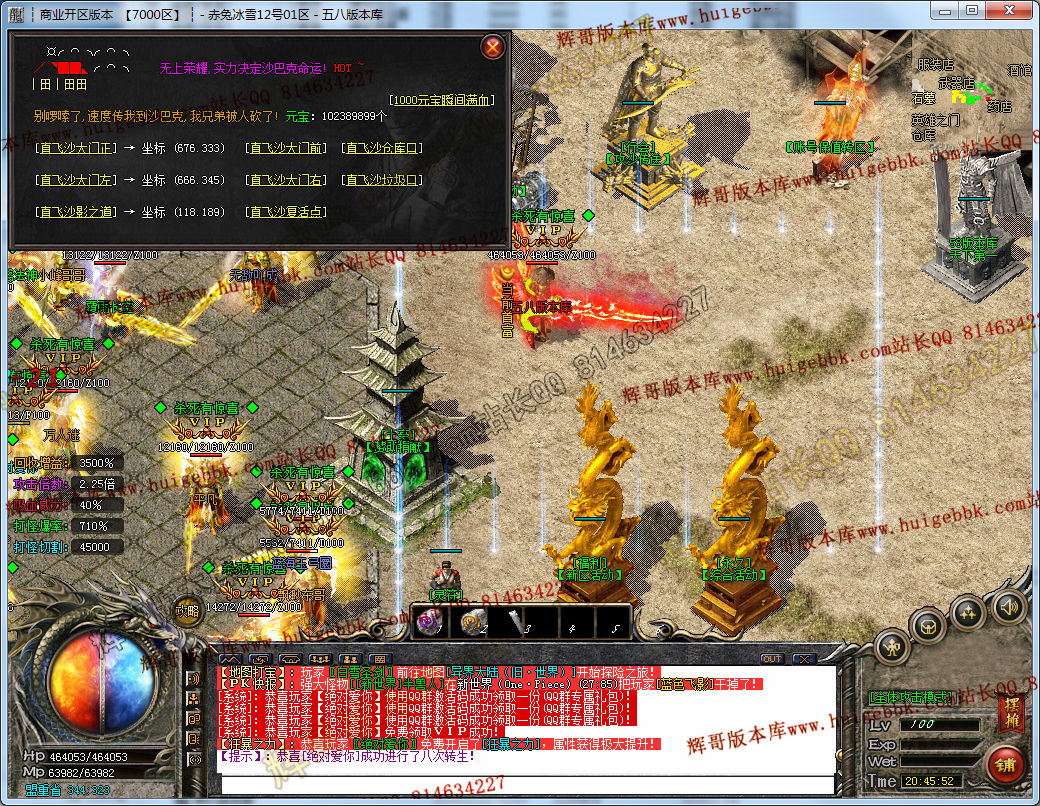 小帮手→沙城捐献(有地图):获得永久属性1.3倍攻 爆率+60% 回收+1000% 刀刀切割+11000 HP+1000 -------充值40米获得