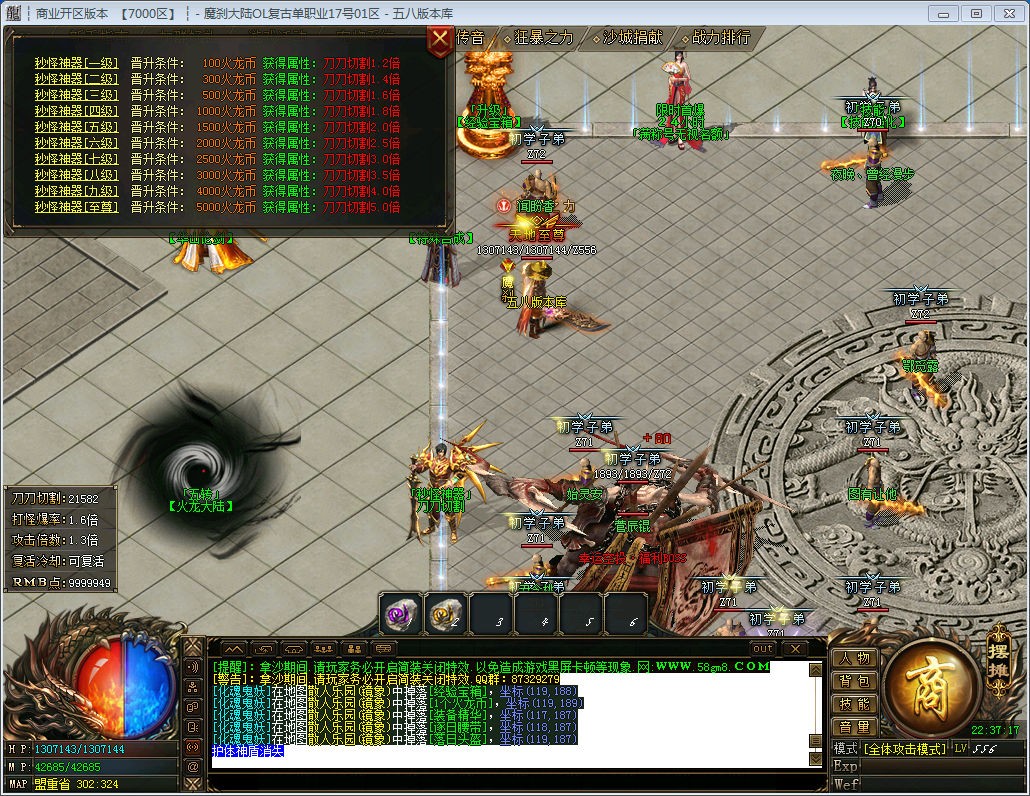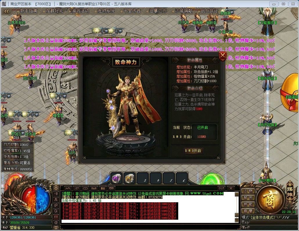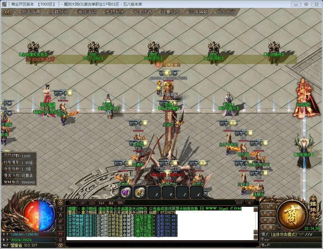 版本介绍:新区开区2小时必出一个爆次终极衣服或者武器的活动怪,散人必抢!
