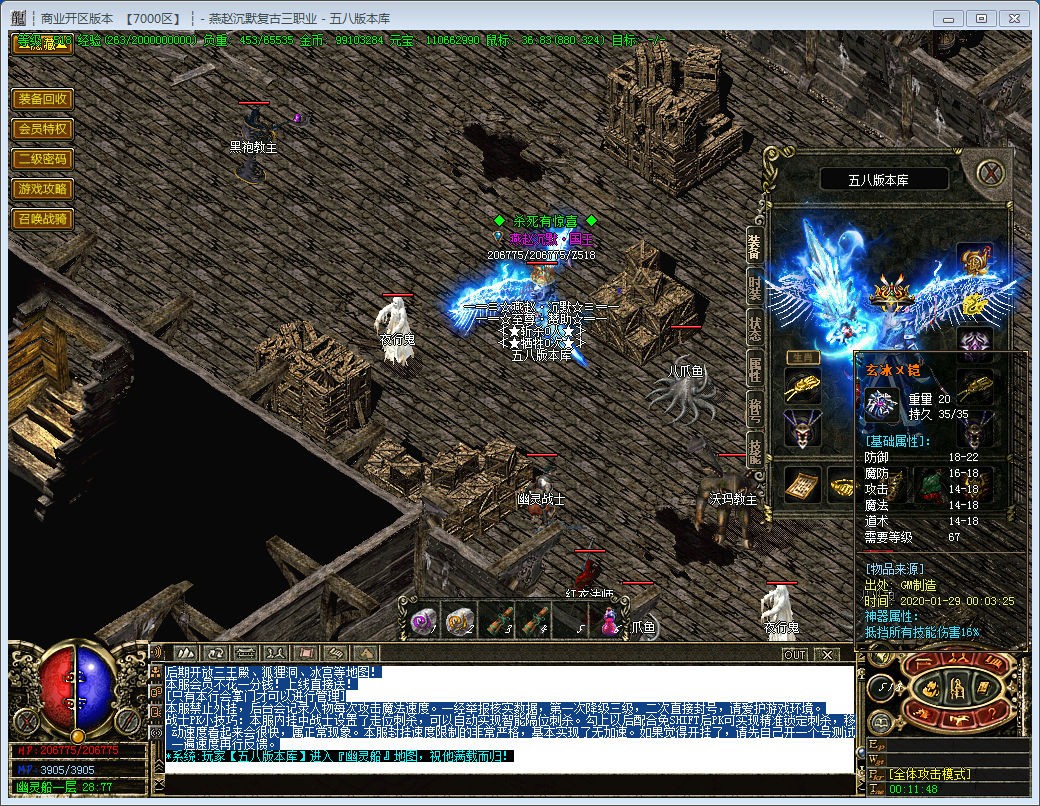 【装备系统】:独采取拾取鉴定的模式,目前共放开到完美品质(攻魔道三属性),品质越高
