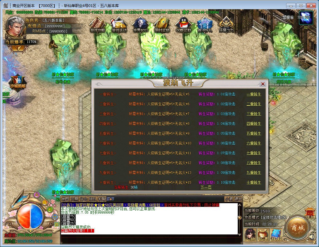 4.转生增加倍攻,等级越高加的越多.转生材料和等级书全部靠打,非常好打.