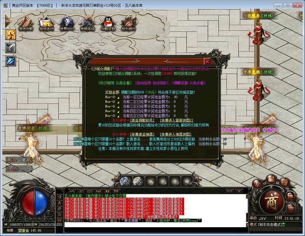 攻略1:散人上线领取QQ群礼包→.终极宠物,然后前往梦幻世界以及(镜像地图)见BOSS就干.直接可以干全服BOSS