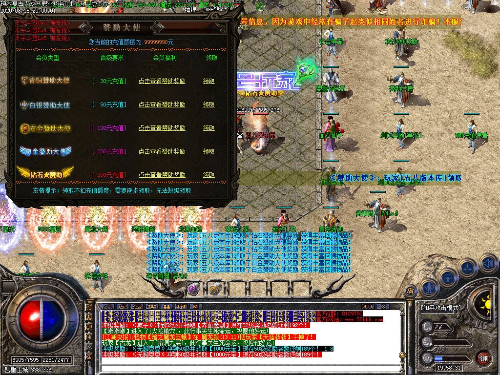 【公告】:为提高人物属性方便玩家打宝,特设置各种NPC,龙的传人,转生服务,爵位捐献,天下第一,武林盟主等。