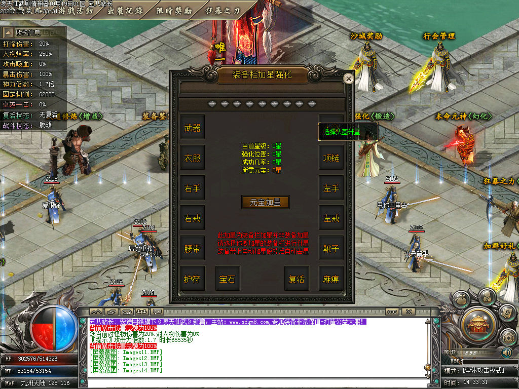 ★元宝可以点上9星,加星是绑定在装备对应的部位而不是装备上面,取下或者爆掉加星部位的装备不会掉星★