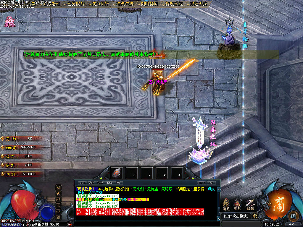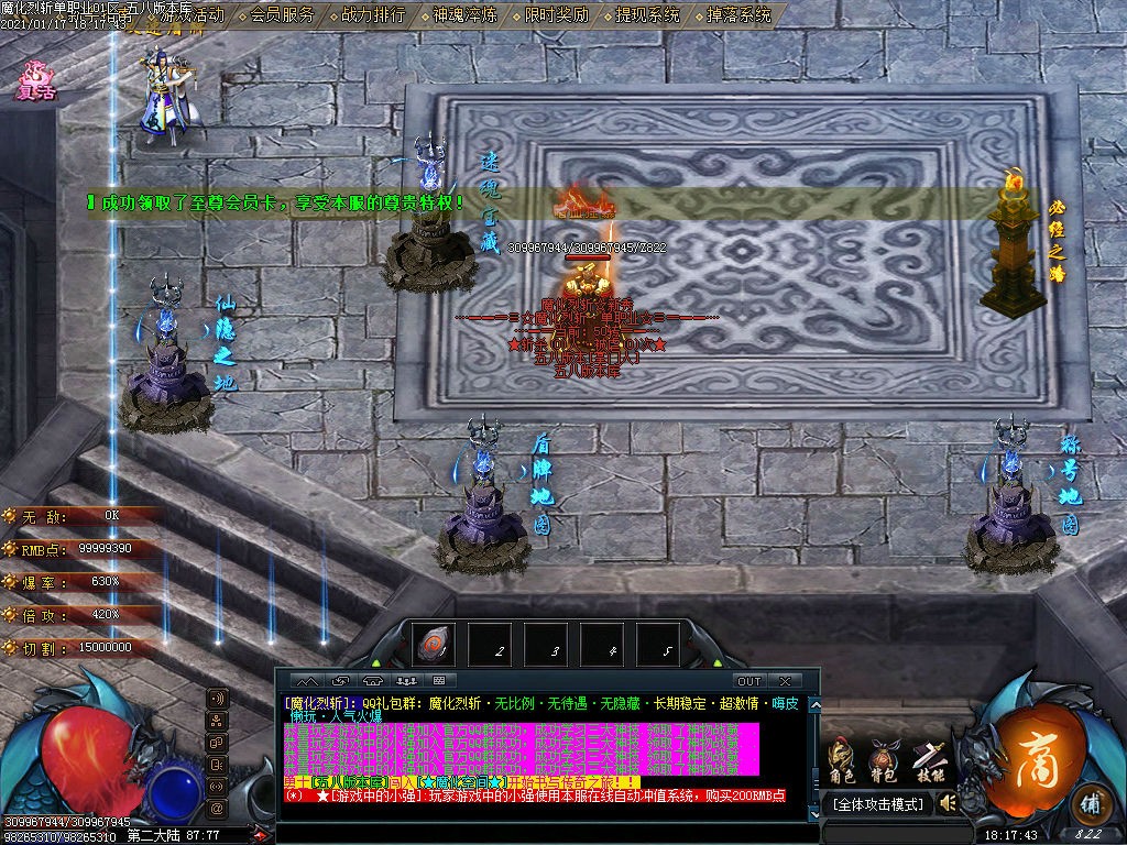 4.转生,等级,爵位都拥有终极大陆,本服活动奖励非常丰厚,记得定时参加,可爆出终极装备