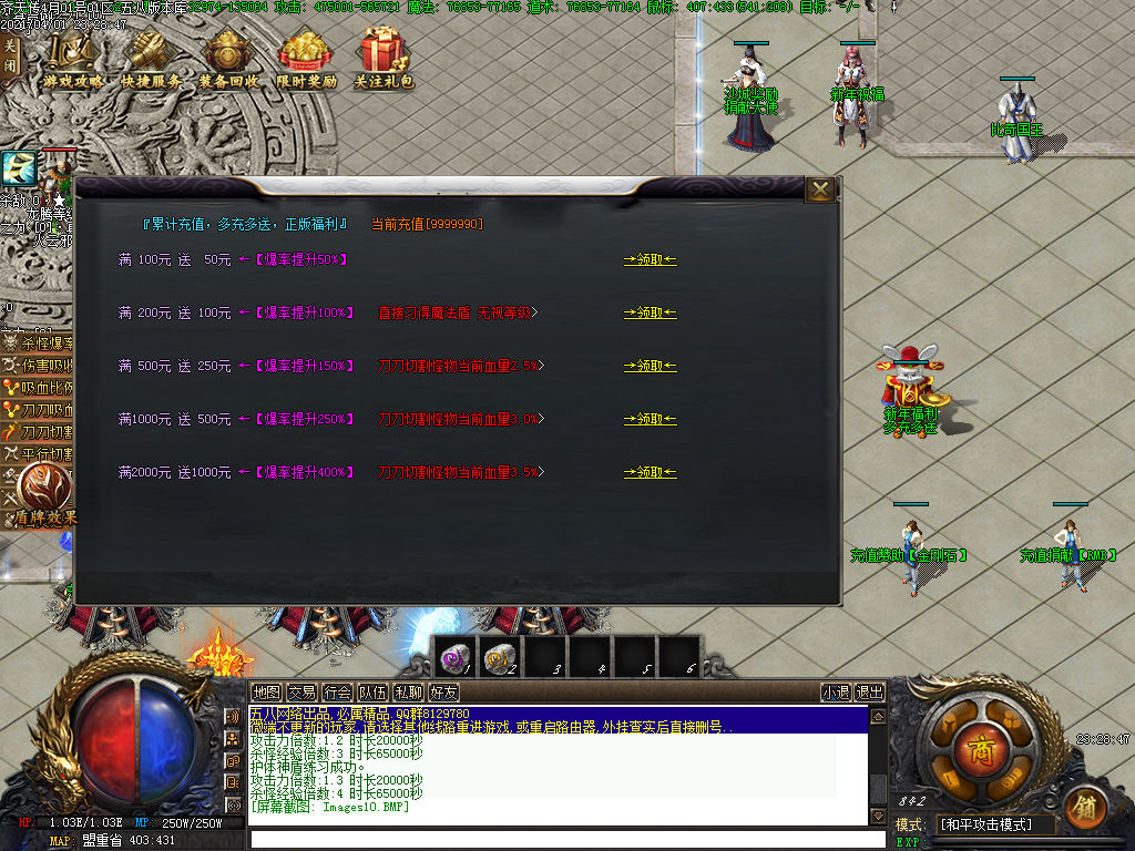 充值达到100 200 500 1000 2000 (都有额外赠送 参考 土城新年多充多送)额外享有额外爆率[200无视等级直接学习魔法盾 500刀刀切割2.5% 1000刀刀切割3% 2000刀刀切割3.5%]