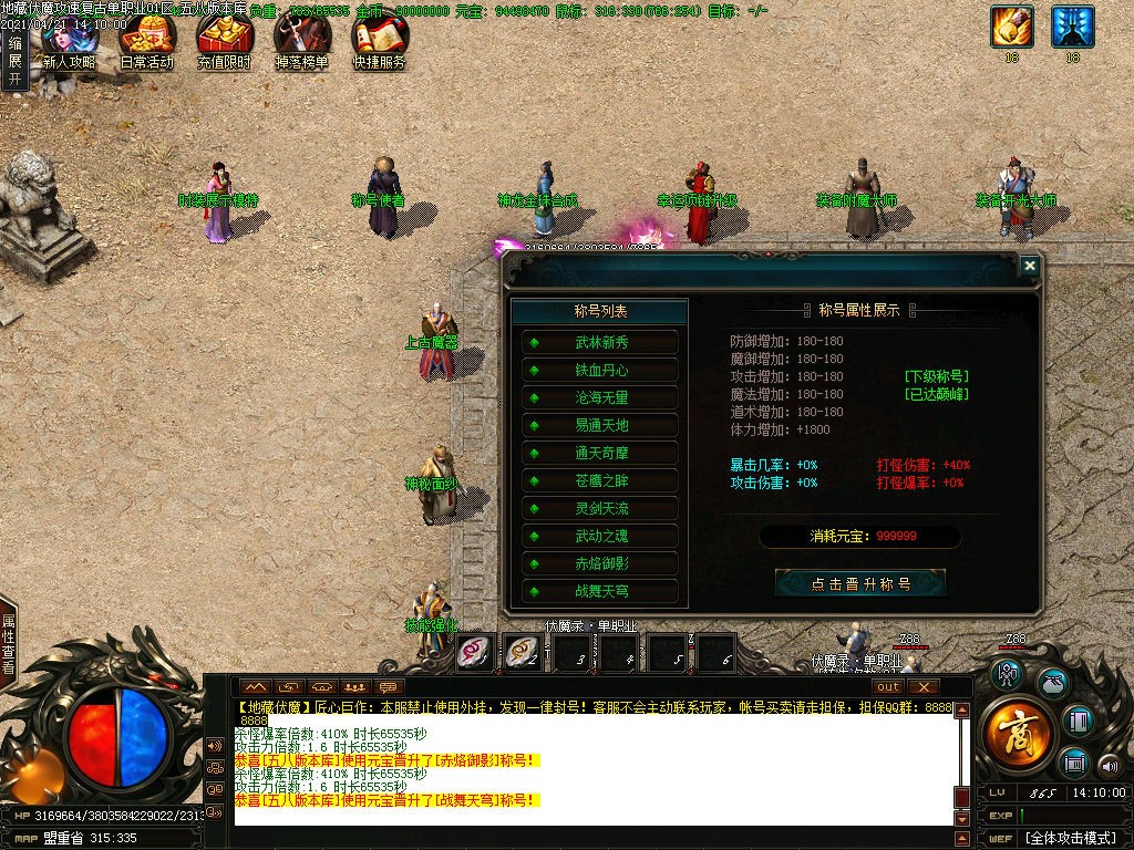 5.神魔之体和称号都可以升满,全方位提升战力,提升打怪速度,装备是靠刷出来的!