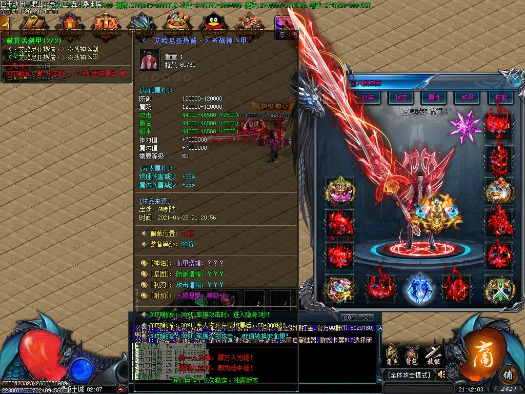 装备:神秘剑甲首饰:60级,特殊:17级,生肖:6级,每个装备都有详细BUFF说明!