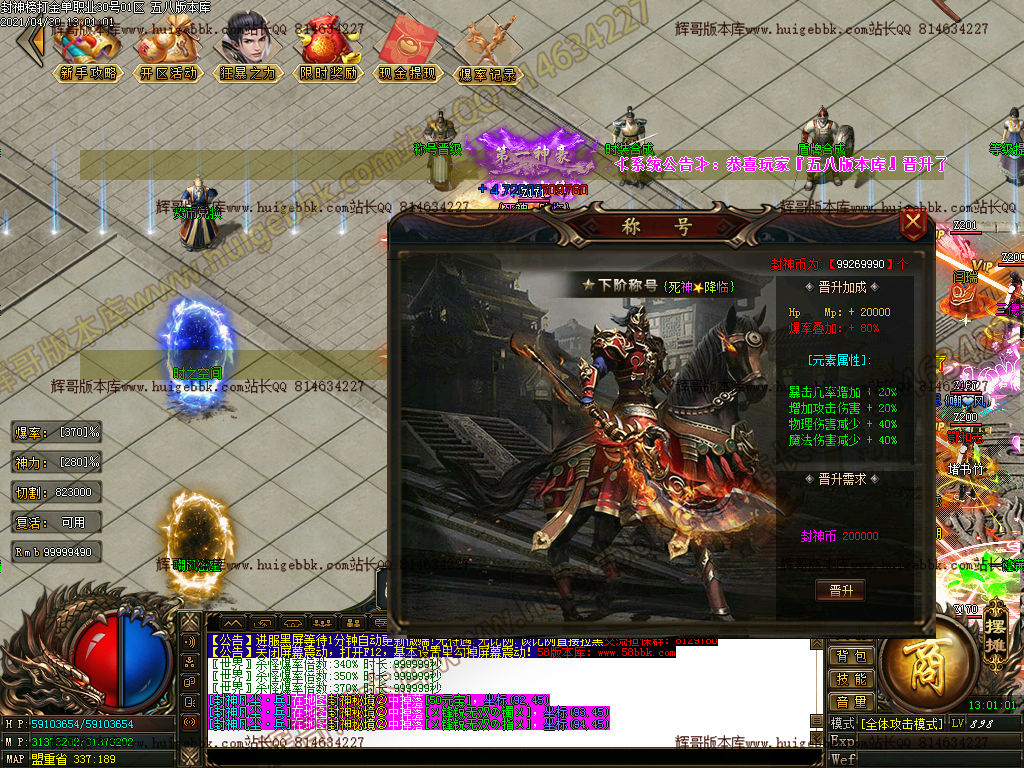 充值50米领取本服顶赞,顶赞送怪物爆率增加50%、50%神力、200级、刀刀切割20000!