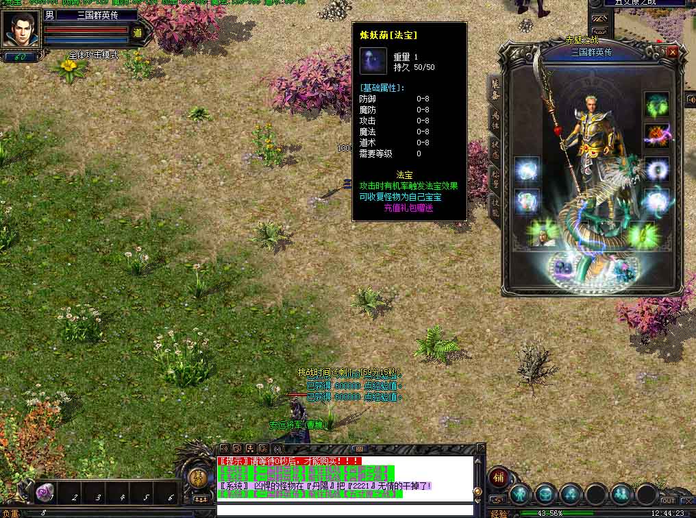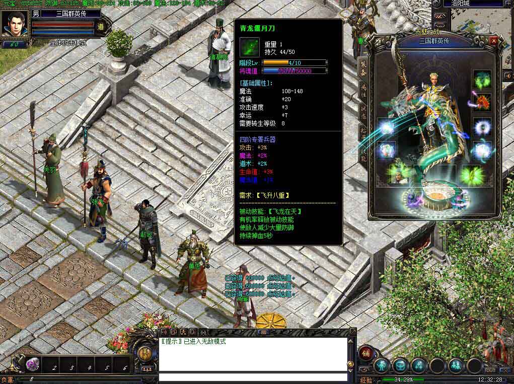 QQ交流群: 2群:249275434 =============================================================健康游戏忠告 抵制不良游戏 拒版游戏 注意自我保护 谨防受骗上当 适度游戏益脑 沉迷游戏伤身 合理安排时间 享受健康生活 1 “装备分为五个阶段:废品→劣质→精致→无暇→神器.新增武将之魂佩戴后可增加属性技能百分比伤害.!! 新增生活技能采药.玩家可以建立小号挖取药引来合成药品进行战斗. 1 新增修炼系统.可自行选择喜欢的属性进行修炼.永久提升 1 新增武将系统.道士可召唤.武将分阶段.五阶武将有自带技能.新增坐骑系统.坐骑带传送技能. 1 打造专属武器例如:青龙偃月刀.方天画戟等等.带特效和特殊被动技能.新增飞升系统.一共为九重渡劫.渡劫可增加各种属性. 1 增加特色强化系统.满级为+12.装备+12时候技能伤害一起增加5%.!新增武器养成系统.玩家可以击杀怪物获得将魂值来提升武器属性. 1新手上线升级每级增加1点技能点数.自行学习.低级都可以学习厉害的技能.!新增披风系统.披风可在线活动经验无限制泡点.随地享受 1 新增法宝系统.第一件出品炼妖壶战斗时有机率收复怪物为自己宠物.boss一样可以新增副本系统.赤壁之战.五丈原之战等等.可爆出专属特殊装备.. ==============================================================