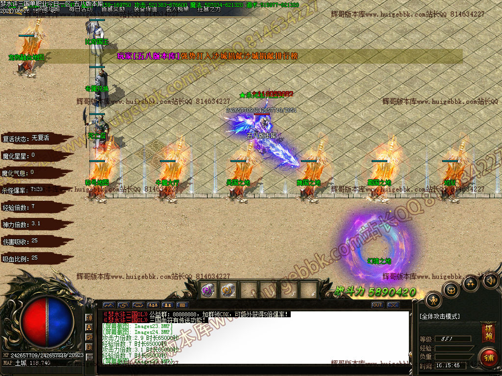 7.在积累一定的装备后0-38充值的玩家最少到100级,100级会送个专属宝宝供散人发育!100充值的玩家因为有黄金赞助上来就有两个宝宝可以考虑打红色的188W的怪物(司马懿、司马昭、孙尚香、诸葛亮、吕梦茹、荀彧)这些怪会爆1.7以下的武器衣服等装备,最主要的是会爆低级的三国专属装备。运气好打到三国装备就可以去三国专属地图,三国专属地图的爆率相对高一些。
