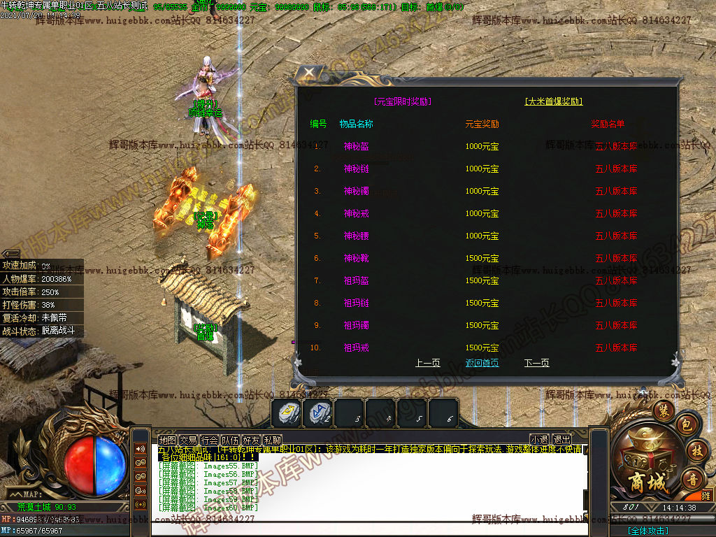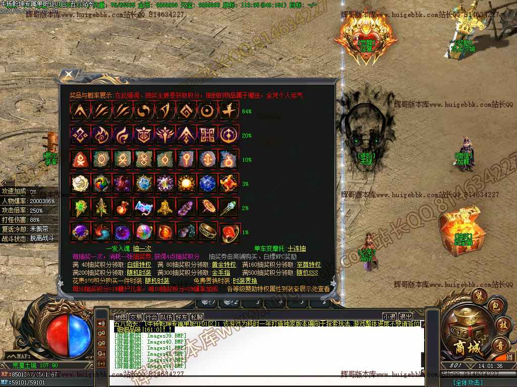 充值玩家上线捐献+狂暴=20米,然后开始10连抽38米 有各种宝物(C级保底)、时装之类都可以抽到,每次抽奖获得4抽奖积分.根据积分数量领取对应的道具