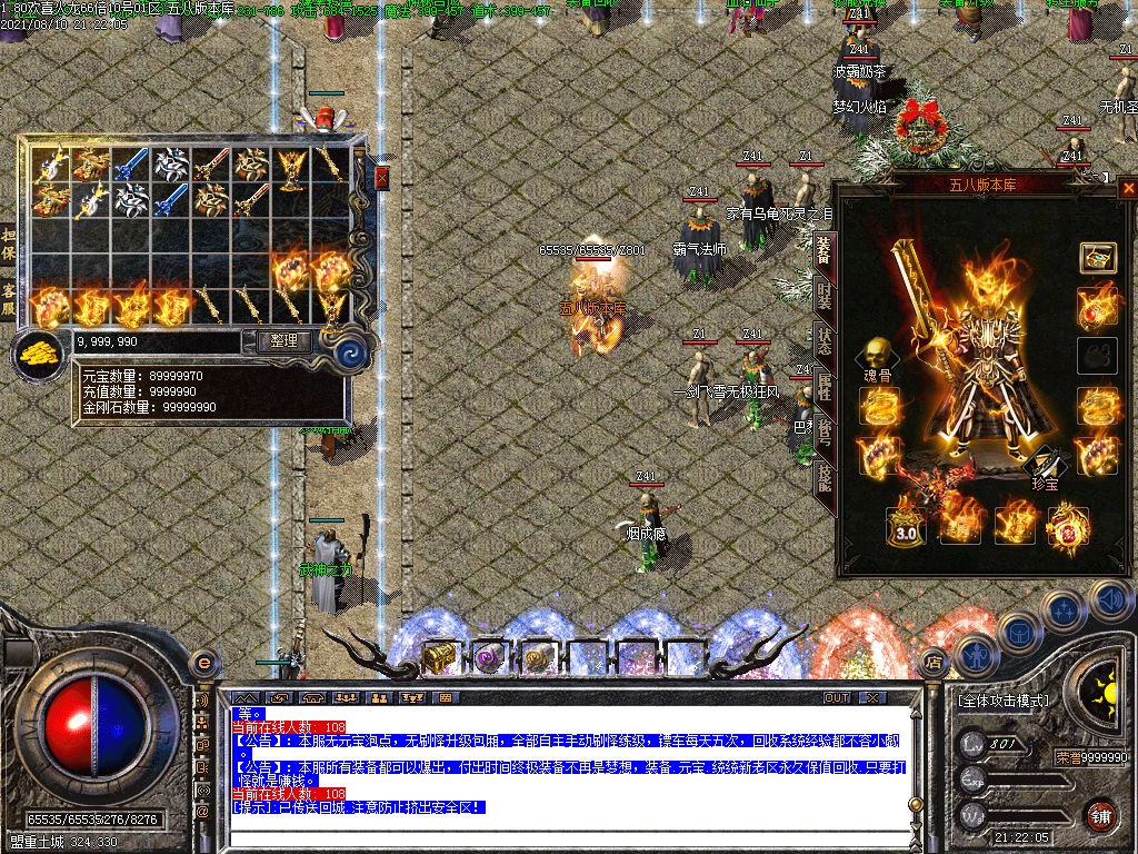 2000米玩家:一个沙捐+一个3.0腰牌+终极时装+终极称号 剩余元宝各种收经验、金刚石、装备 开启遇神杀神无敌模式
