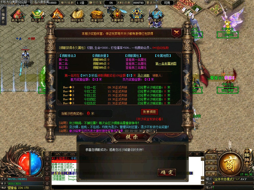 3、沙城捐献前3名属性加成超多,第一名额外可进专属地图,刷新福利怪爆全服所有装备,第一名可以在开区2小时后领取捐献奖池10%金额奖励,可提米!
