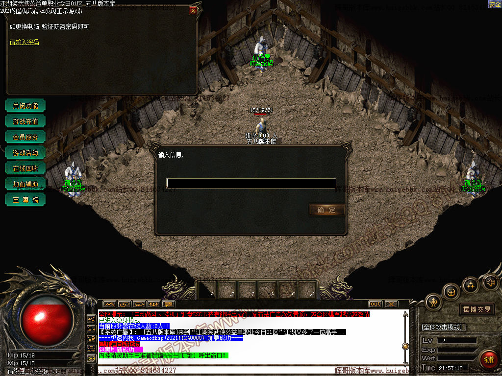 作为一个散人,你最好应该双开,一个战士挂机升级,道士去各大陆地图打装备