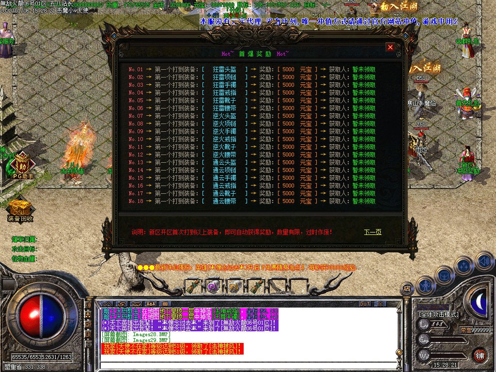 游戏介绍新区第2天下午台区 ,第2天晚上晚8点攻沙,首次沙奖励800W元宝, 以