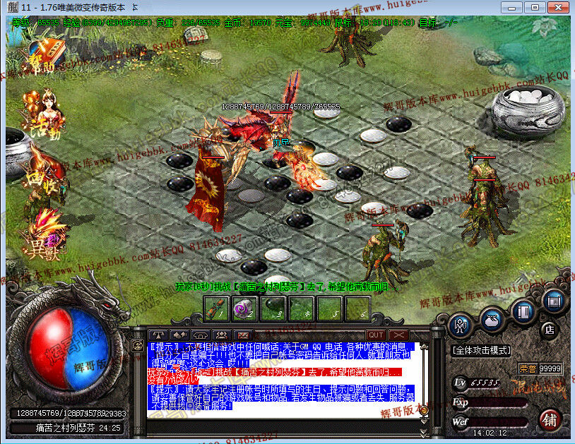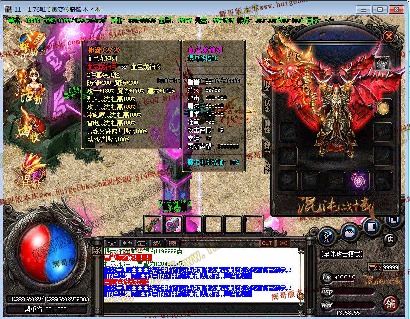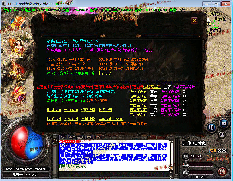 [251]〖公告〗:★★★混沌战域★★★独家复古传奇.欢迎你的到来.〖公告〗:★★★混沌战域★★★独家复古传奇.欢迎你的到来.[251]〖公告〗:★★★游戏中所有喊话说加什么★QQ★比例多少.有什么优惠的全是骗子.★他用的软件刷的★请大家不要上当哟...〖公告〗:★★★游戏中所有喊话说加什么★QQ★比例多少.有什么优惠的全是骗子.★他用的软件刷的★请大家不要上当哟...[251]〖公告〗本服采用微端技术.边玩边更新.如遇黑屏.等待一会就好了!!!〖公告〗NPC打开后没对话框或界面错乱请按Esc键关闭然后再打开即可正常使用.!!![251]〖公告〗新玩家进服后.可以土药砍猪.既可以升级又能获得元宝.!!!〖公告〗新玩家进服后.可以土药砍猪.既可以升级又能获得元宝.!!![251]〖公告〗本服开出特殊极品属性:武器加伤害:最高15%..衣服加体质:最高20点..项链加无视:最高20%..手镯加体质:最高20点..戒指加伤害:最高10%..头盔加体质:最高20点..玉佩加经验:最高20%..等!!!全打怪爆.无合成骗元宝等...[251]〖提示〗:新区开后第二天拿沙.拿沙奖励40W元宝400混沌币.老区天天拿沙奖励20W元宝200混沌币..还有沙会专署NPC的各种待遇等着你!沙巴克之荣耀万岁!!!〖提示〗:新区开后第二天拿沙.拿沙奖励40W元宝400混沌币.老区天天拿沙奖励20W元宝200混沌币..还有沙会专署NPC的各种待遇等着你!沙巴克之荣耀万岁!!![251]〖提示〗:不要相信游戏中任何喊话:关于GM QQ 电话 各种优惠的消息...百分之百是骗子!!!也不要把自己帐号密码告诉给任何人.就算朋友也得留意啊.这个这会.哎!!!〖提示〗:不要相信游戏中任何喊话:关于GM QQ 电话 各种优惠的消息...百分之百是骗子!!!也不要把自己帐号密码告诉给任何人.就算朋友也得留意啊.这个这会.哎!!![251]〖提示〗:请大家牢记注册帐号时所填写的生日、提示问题和回答问题,请妥善保管好自己的游戏帐号和物品.若发生物品被骗或者丢失.服务器不提供找回装备服务!〖提示〗:请大家牢记注册帐号时所填写的生日、提示问题和回答问题,请妥善保管好自己的游戏帐号和物品.若发生物品被骗或者丢失.服务器不提供找回装备服务![251]〖公告〗本服活动比较多.每次活动多少都会有收获的.请大家积极参与!!!〖公告〗不要抱怨装备不好打,因为本服是长期服,走服玩家请绕行:不要抱怨别人的装备好,有付出就肯定有收获的! [251]〖公告〗道士45级招神虎.50级招神虎王.55级招暴走神虎王.那是相当的强悍的..还有神圣属性越高.宝宝越厉害...〖公告〗道士45级招神虎.50级招神虎王.55级招暴走神虎王.那是相当的强悍的..还有神圣属性越高.宝宝越厉害...[251]〖公告〗:声望对本服来说相当重要.开暴走要声望.穿声望装备要声望.换声望装备要声望.以后还会更新更多的关于声望的东西...但是唯一一点声望那是相当的好弄到的.〖公告〗:声望对本服来说相当重要.开暴走要声望.穿声望装备要声望.换声望装备要声望.以后还会更新更多的关于声望的东西...但是唯一一点声望那是相当的好弄到的. ▄▄▄▄◣温馨提示:凡是游戏中【喇叭喊话】带有客服QQ号码的全是骗子冒充的.特别是【喇叭喊话】,请正确区别【喇叭】和【公告】▄▄▄▄◣ ==============================================================