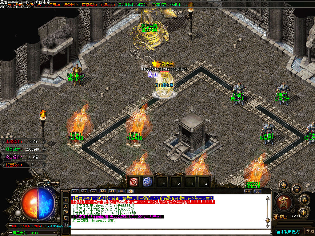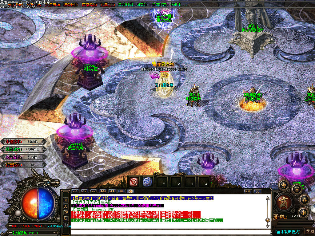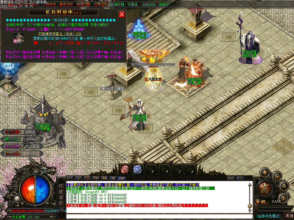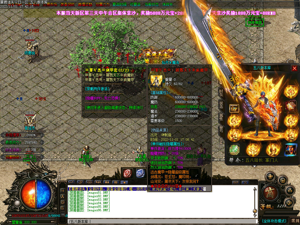 捐献(30米)+ 乾坤玉佩(58米点)属性:超级鞭尸+隐身+传送+刀刀切割500W,而且额外提高3倍的爆率!