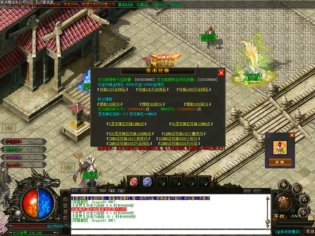 捐献(30米)+ 乾坤玉佩(58米点)米点比例1-10 等于5块8 属性:超级鞭尸+隐身+传送+刀刀切割500W,而且额外提高3倍的爆率!