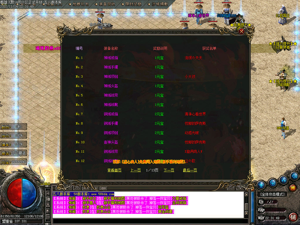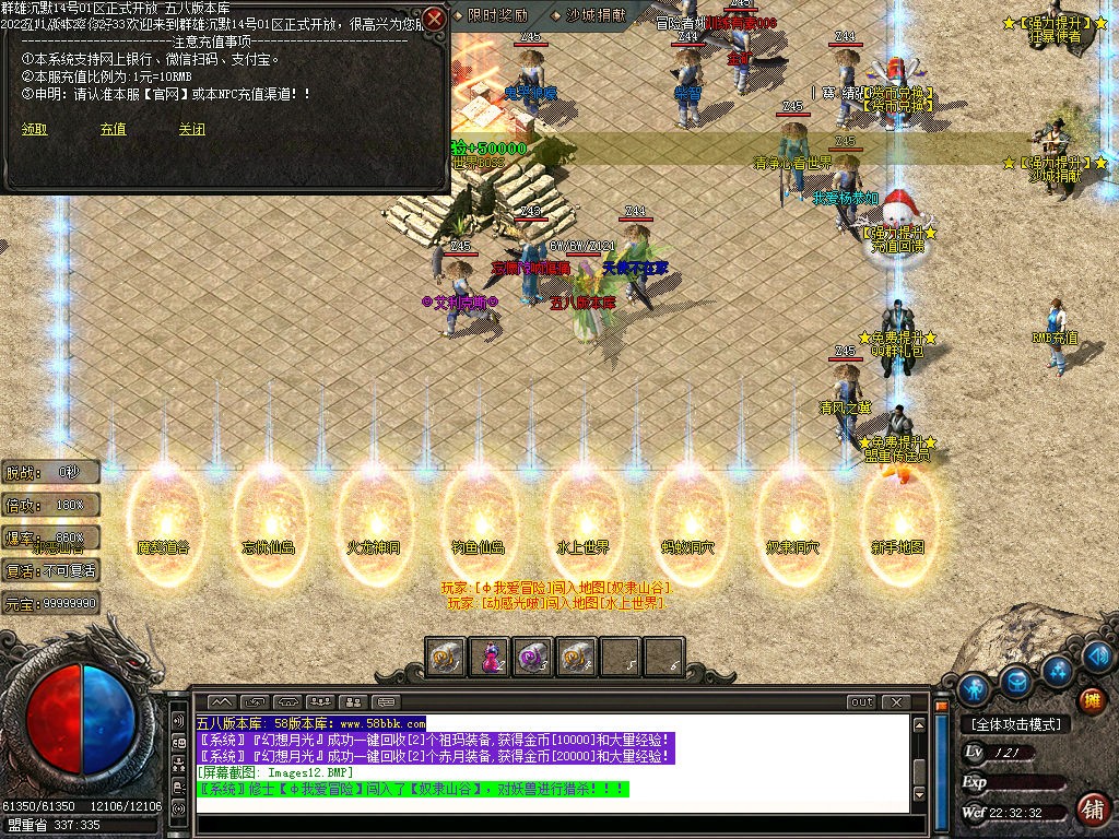 2.充值88米在土城右下角【充值回馈】NPC领取豪华礼包,超高随身泡点、特戒、 可以自动捡物的【暴击斗笠】、以及一套高级法宝、更有大量【神宠精米】可以直接将自身宠物进行强化,宠物是前期打宝的重要助力、最重要的当然是升级快才可以进入高级地图进行打宝,所以更是配备了【惊寂之光】超级技能,拥有它就可以免费进入【魔宠圣地】直接诱惑5只强大的怪物协助你升级!赠送不物品当然止如此,爆率、材料、时装、武林秘籍、特戒都包含在内!!