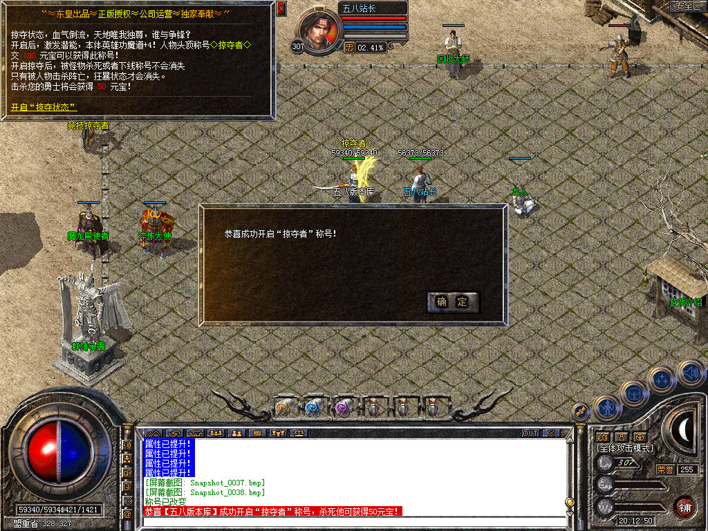 竞技掠夺者 100元宝购买称号一次,获得本体和英雄+4自适应攻魔道,击杀该称号的玩家可获得50元宝,死亡,称号消失