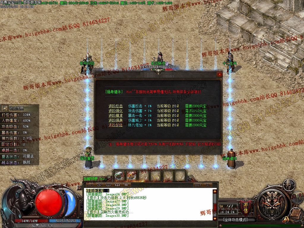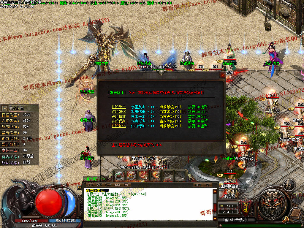8.前期若发现自己扛不住怪 可以直接放手让宝宝去打!有条件了 去把强身健体搞一搞 伤害减少 体力增加 是抗怪必备 土城 仙界 神域 魔督 都能提升 不管PK还是打怪都很强