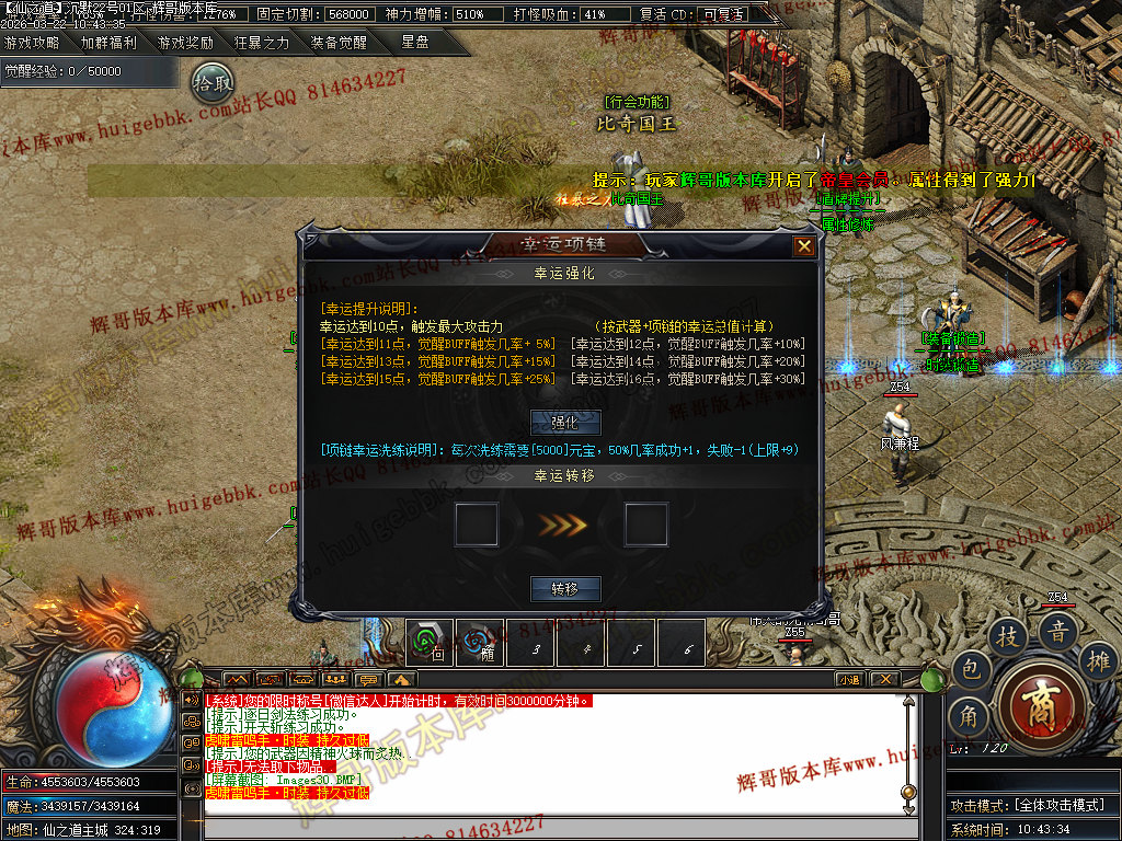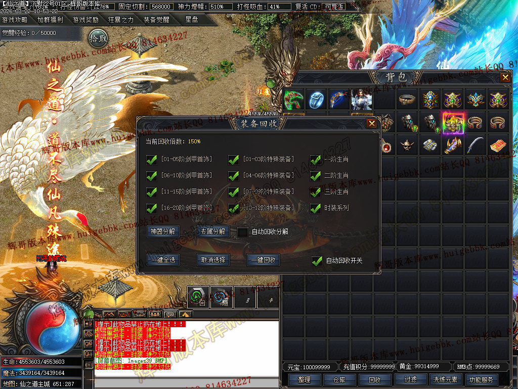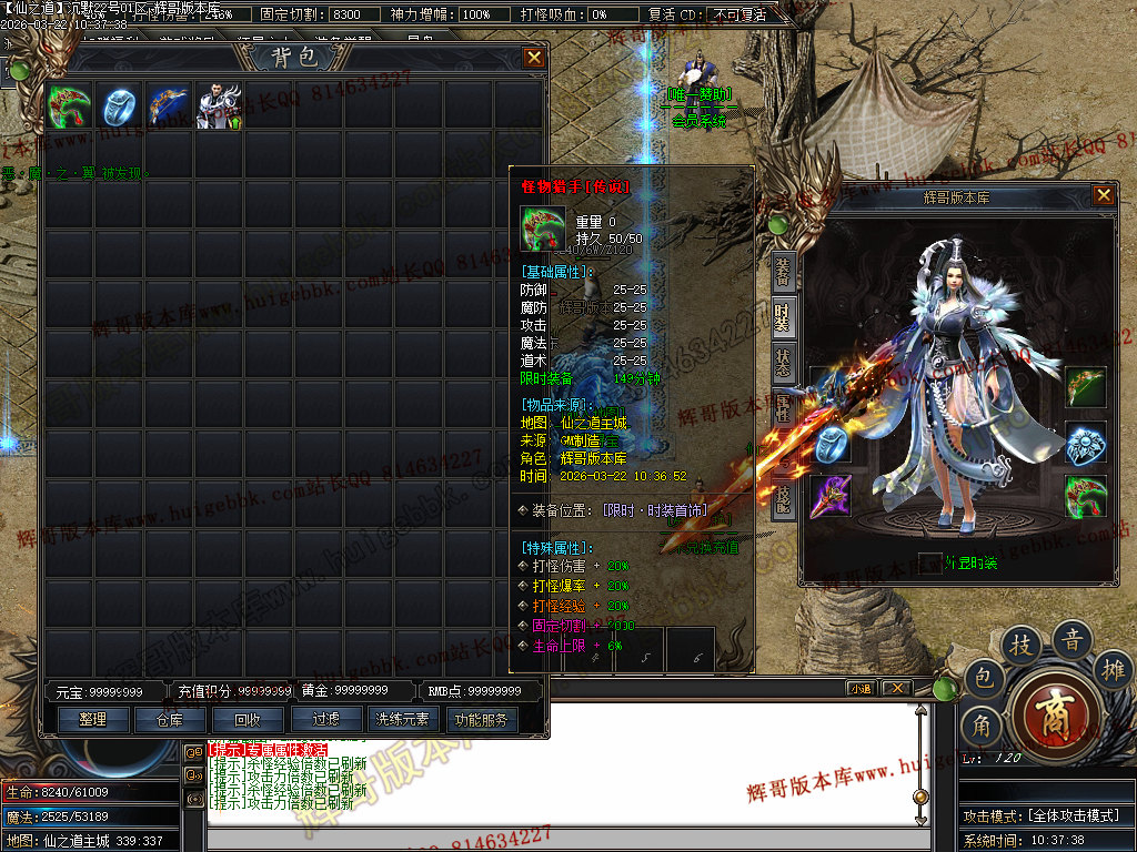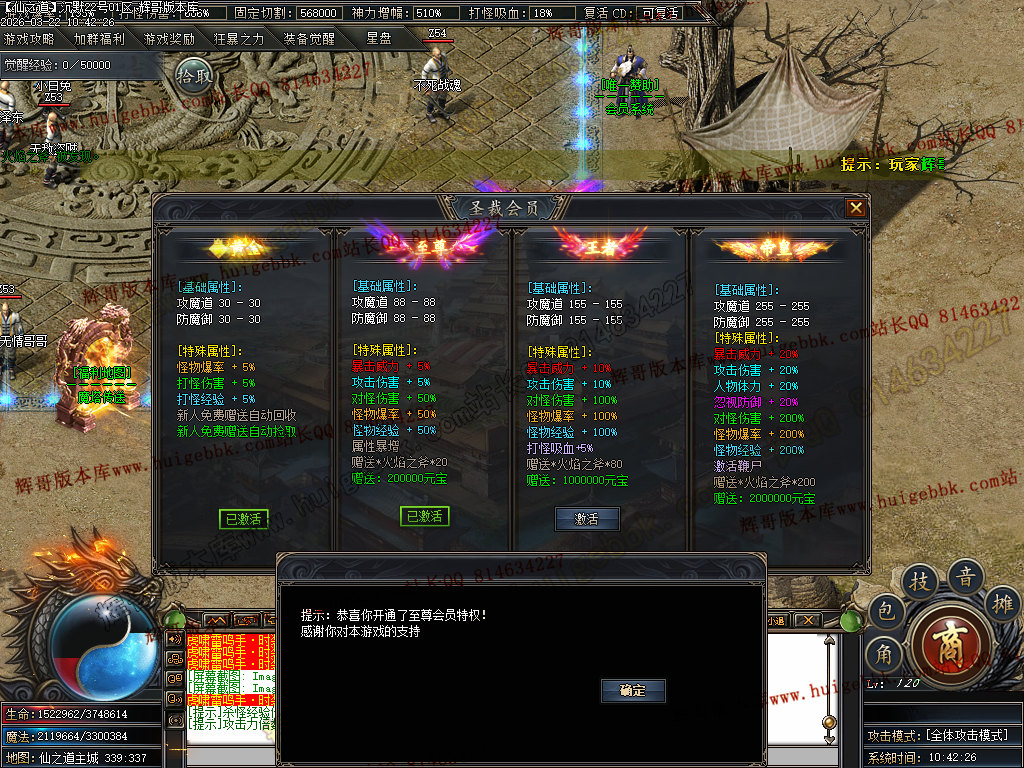 【御道会员】:998元充值积分+150000黄金领取 提升 500%打怪伤害 500%怪物爆率 攻速+100%(暴击威力+50% 攻击伤害+50% 体力元素+50% 忽视防御+30%)
