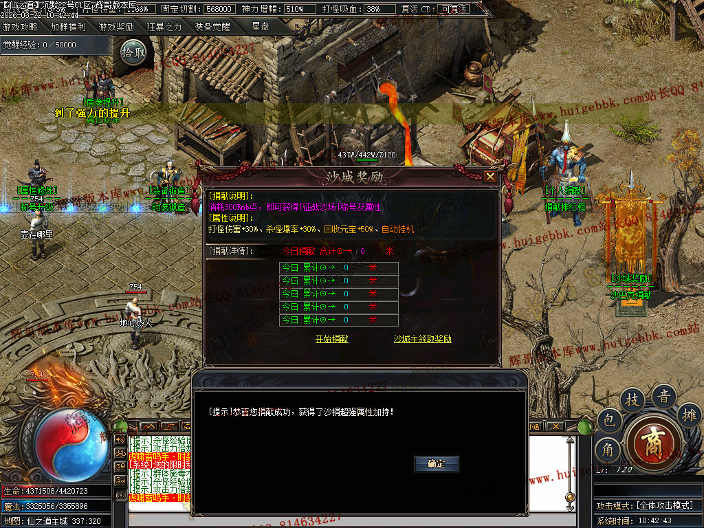 沙场捐献=300RMB点开启[打怪伤害+30% 怪物爆率+30% 回收元宝+50% 附带自动回收功能]
