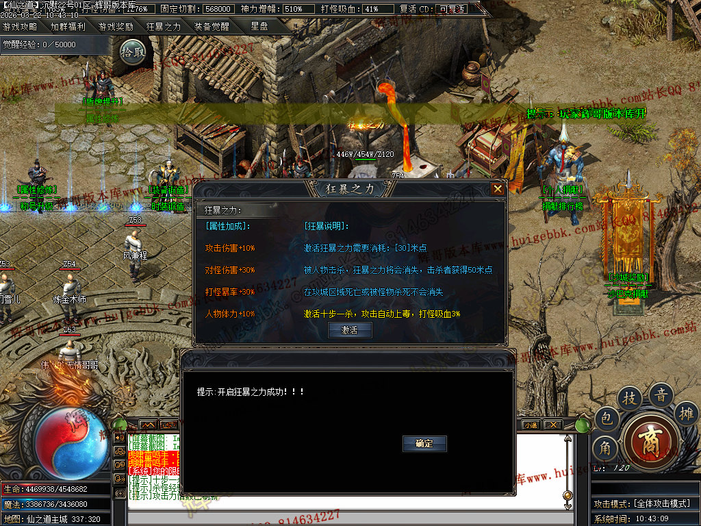 狂暴之力=100RMB点开启[攻击伤害+10% 体力元素+10% 打怪伤害+30% 怪物爆率+30% 攻击自动红绿毒 赠送神技 十步一杀(几率麻痹)]