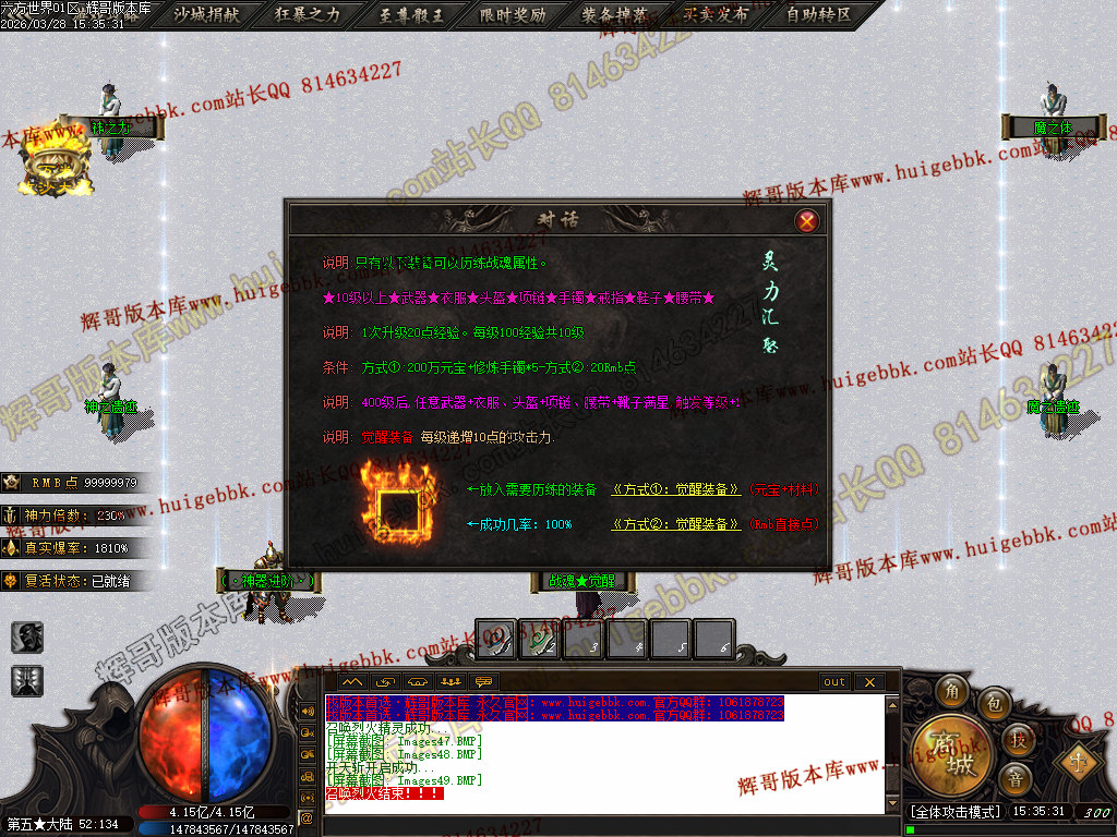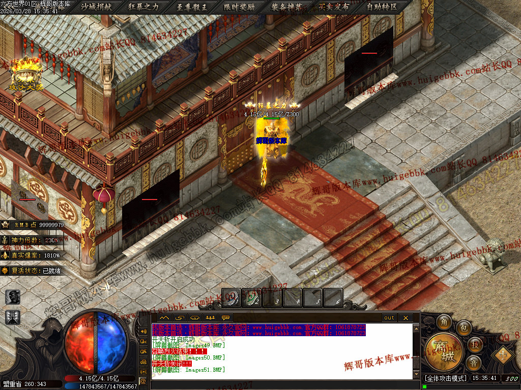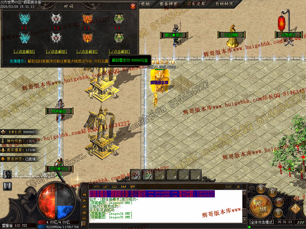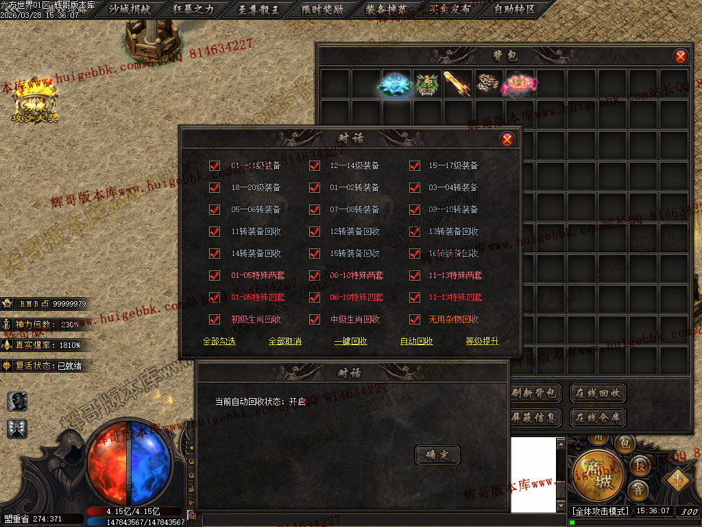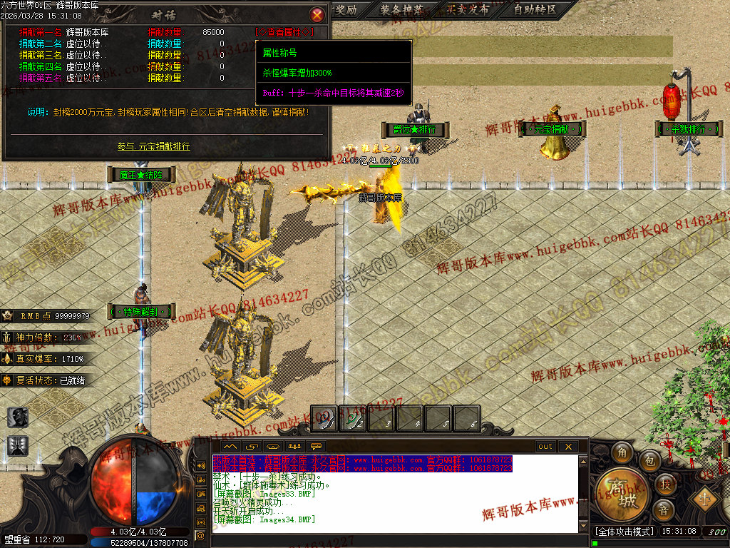 5.【神爷赞助】 充值数700 或 500修炼手镯 领取 爆率+500  全属性+8888  全元素+ 10%  几率切割怪物 6%生命 全屏吸怪附带绿毒范围20*20