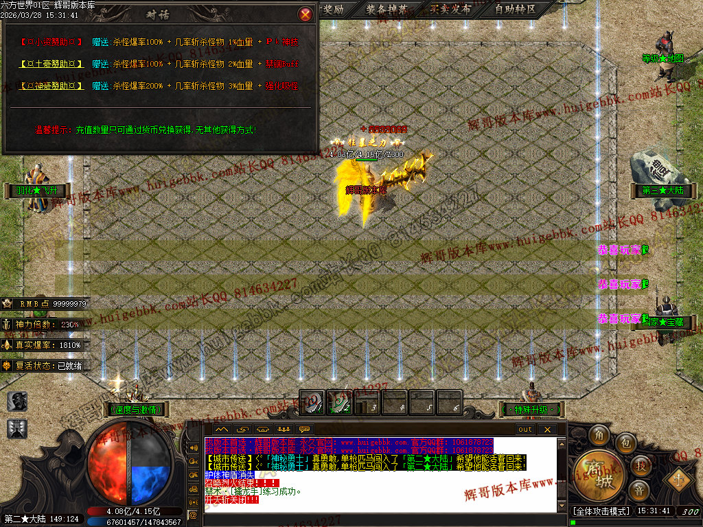 3.【神豪赞助】 充值数300 或 300修炼手镯 领取 爆率+300  全属性+3333  全元素+ 6%   几率切割怪物 3%生命 全屏吸怪附带绿毒范围15*15