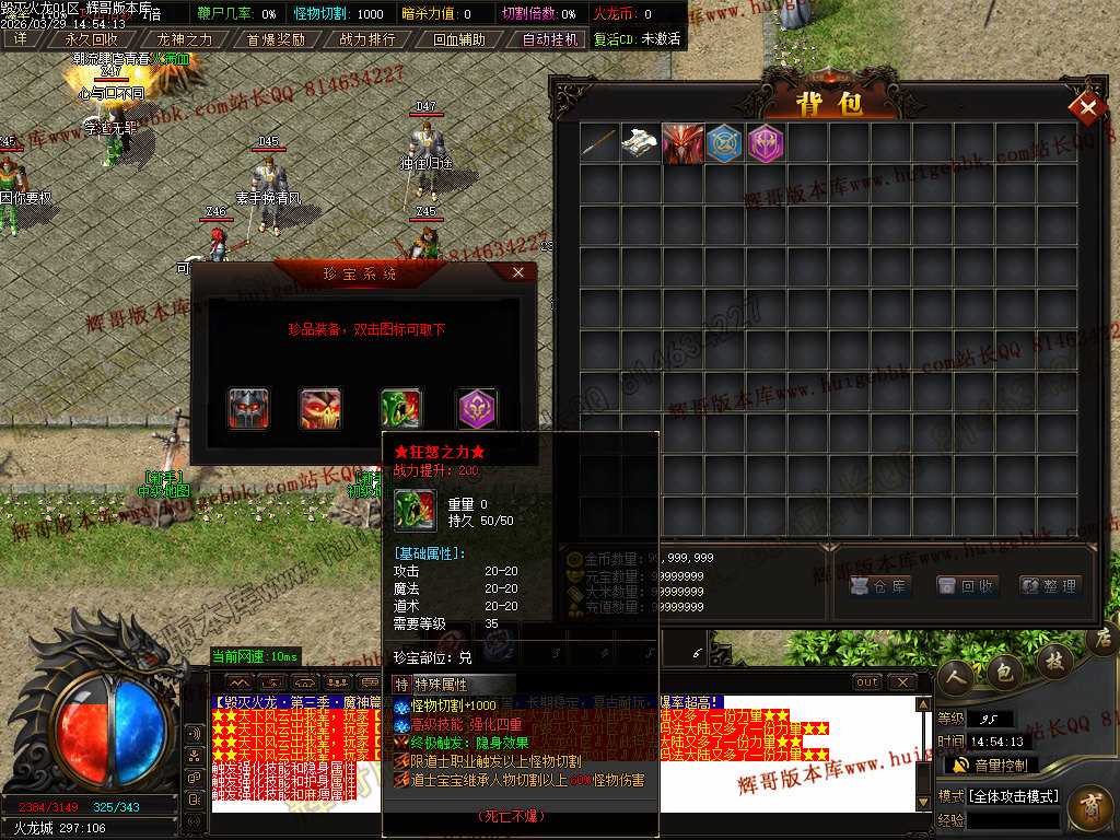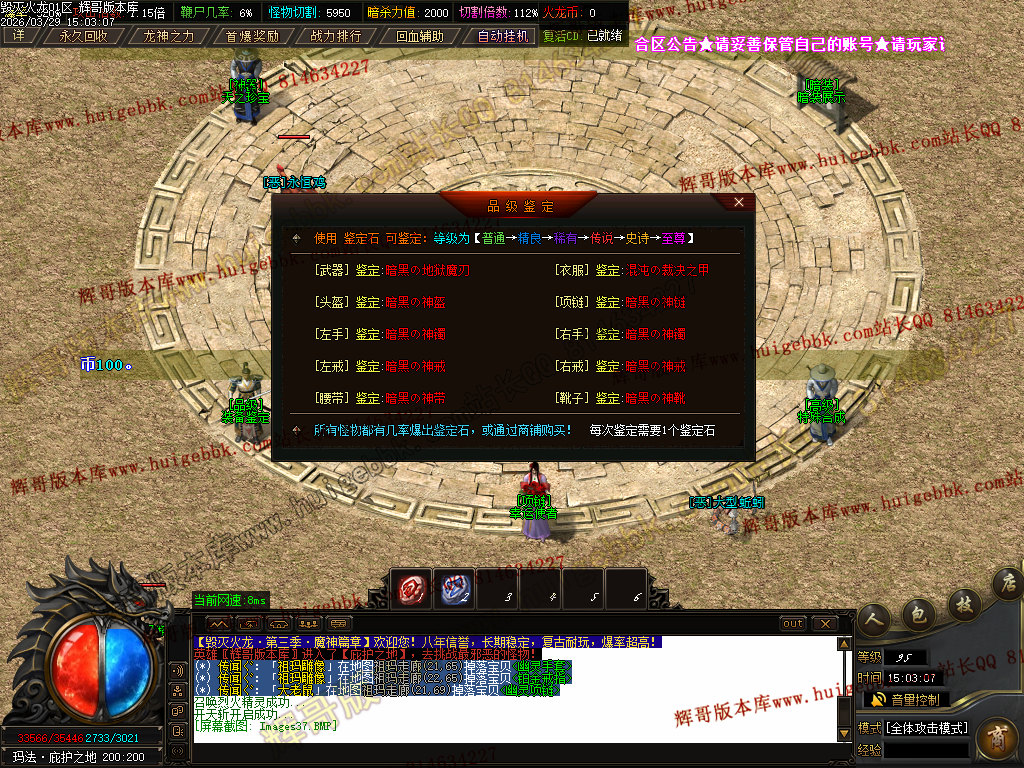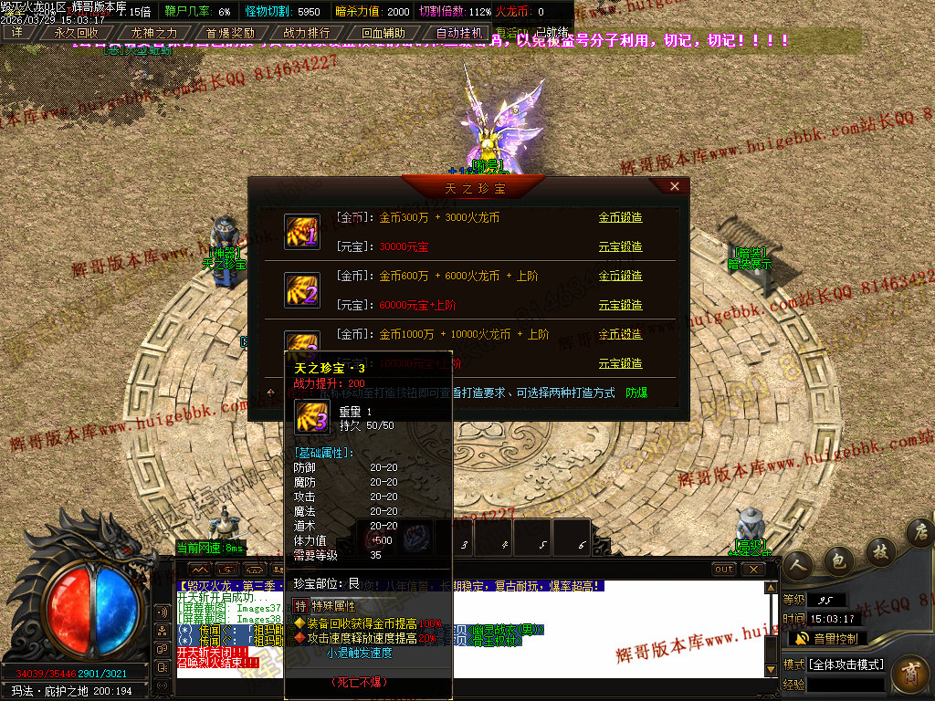 盟重省坐标344 333 藏珍老人NPC可进入藏珍阁 藏珍阁一层合成生肖 二层合成高级特殊四格以及星座洗练增加属性! 三层可升级装备属性!