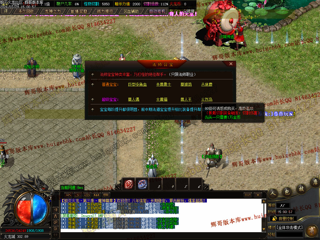 道士(打宝必备):道士60级圣兽,65级双圣兽,70级白虎,75级双白虎,80级超级虎王,85级双超级虎王,90级BUFF雷神,95级BUFF双雷神,完爆各种BOSS以及玩家。