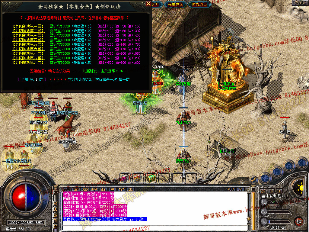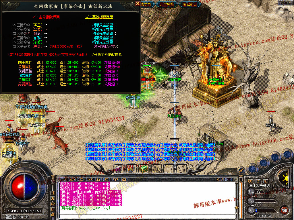 神豪消费:100金币开赞助、200金币沙捐、20金币开狂暴100金币吃苹果 上线弄2套 武器爆3项链爆5 等级65 (直接充值1000元金币起飞)