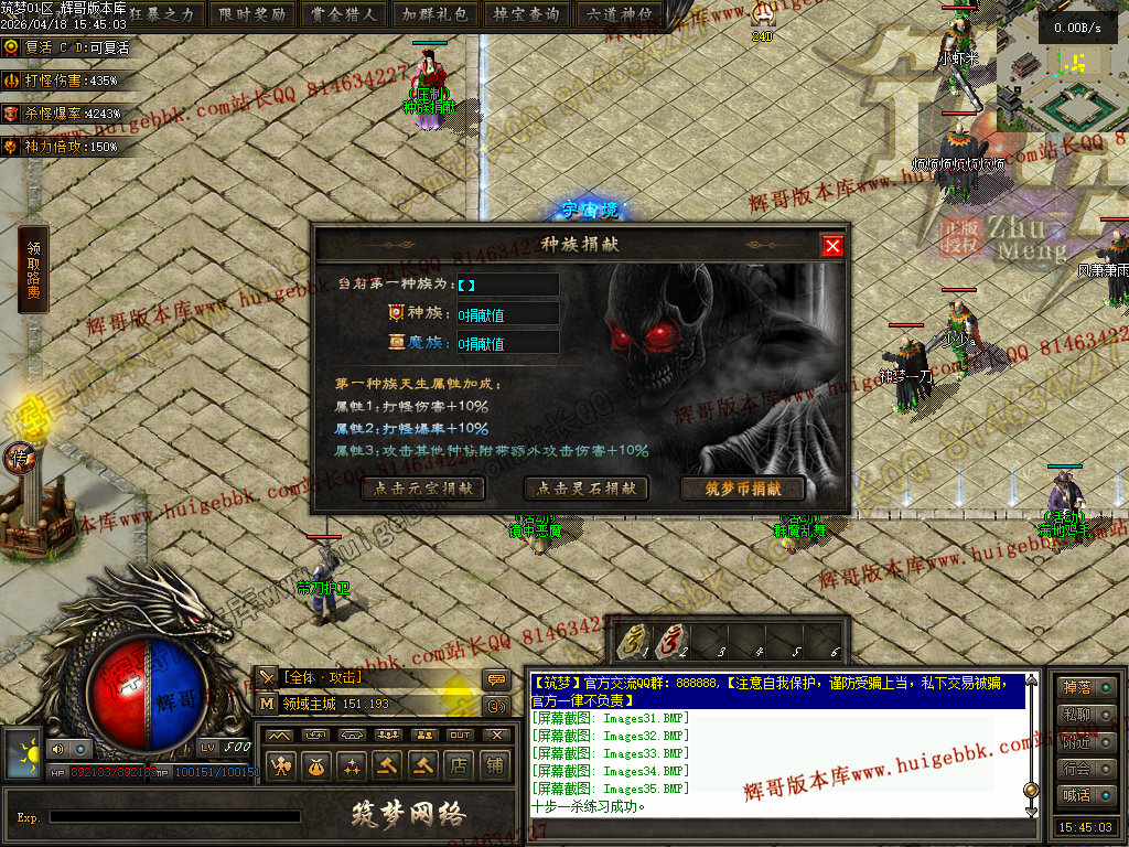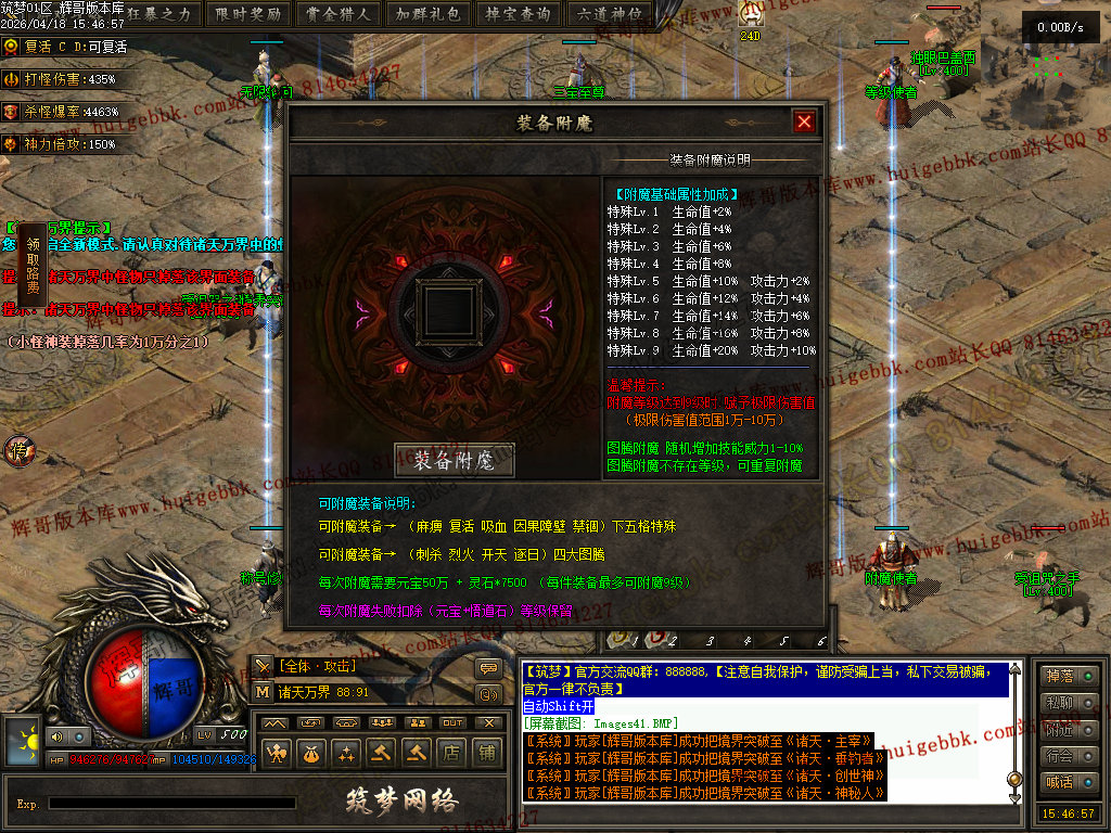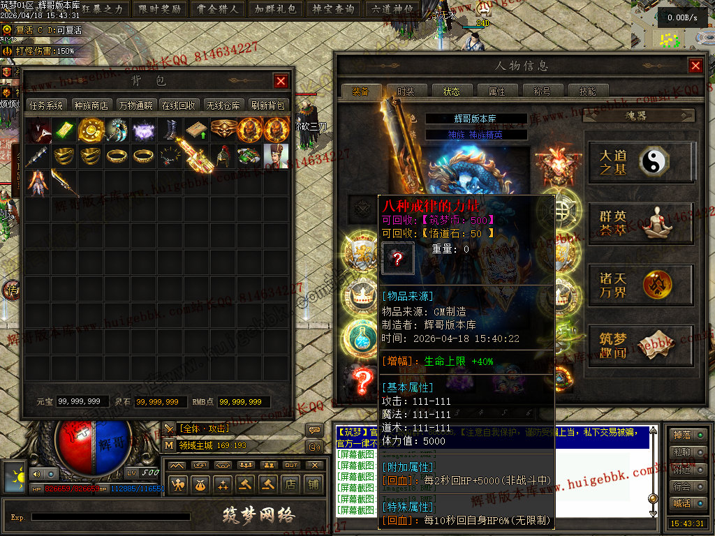 │捐献1888点封榜,打怪伤害+30%,打怪爆率+50%,全属性+5% ,倍功神力+30%,赠送;群体施毒术,攻速+1            │